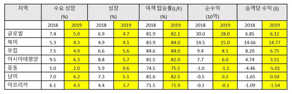 화물 부문은 2018년의 6,330만 톤과 비슷한 6,310만 톤에 머무를 것으로 예상하지만, 역사적으로 정치적 불안 및 갈등은 결코 좋은 영향을 끼치지 않기에, 최근 보호무역주의적 조치가 확산되고 미-중 무역 전쟁 악화되면 항공화물 수요는 감소될 것으로 내다봤다.