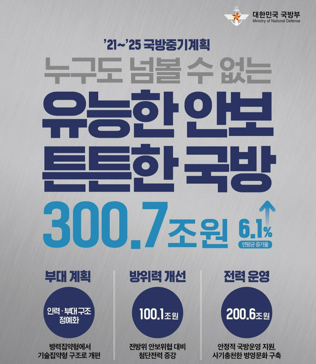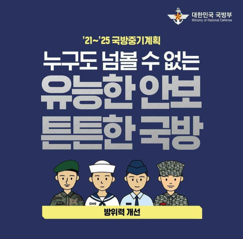 지난 50년간 국산 무기체계 개발의 산실인 국방과학연구소가 얼마 전 선보인 탄도미사일 현무-4가 강력한 존재감으로 국민 모두의 찬사를 받고 있는 가운데, 지난 9일 국방부는 튼튼한 안보 전력 구축과 운영을 위해 앞으로 향후 5년간 현재와 미래 세대를 위해 평화를 지키고 평화를 만드는 혁신강군으로 거듭나기 위한 ‘2021∼2025년 국방중기계획’을 발표했다.