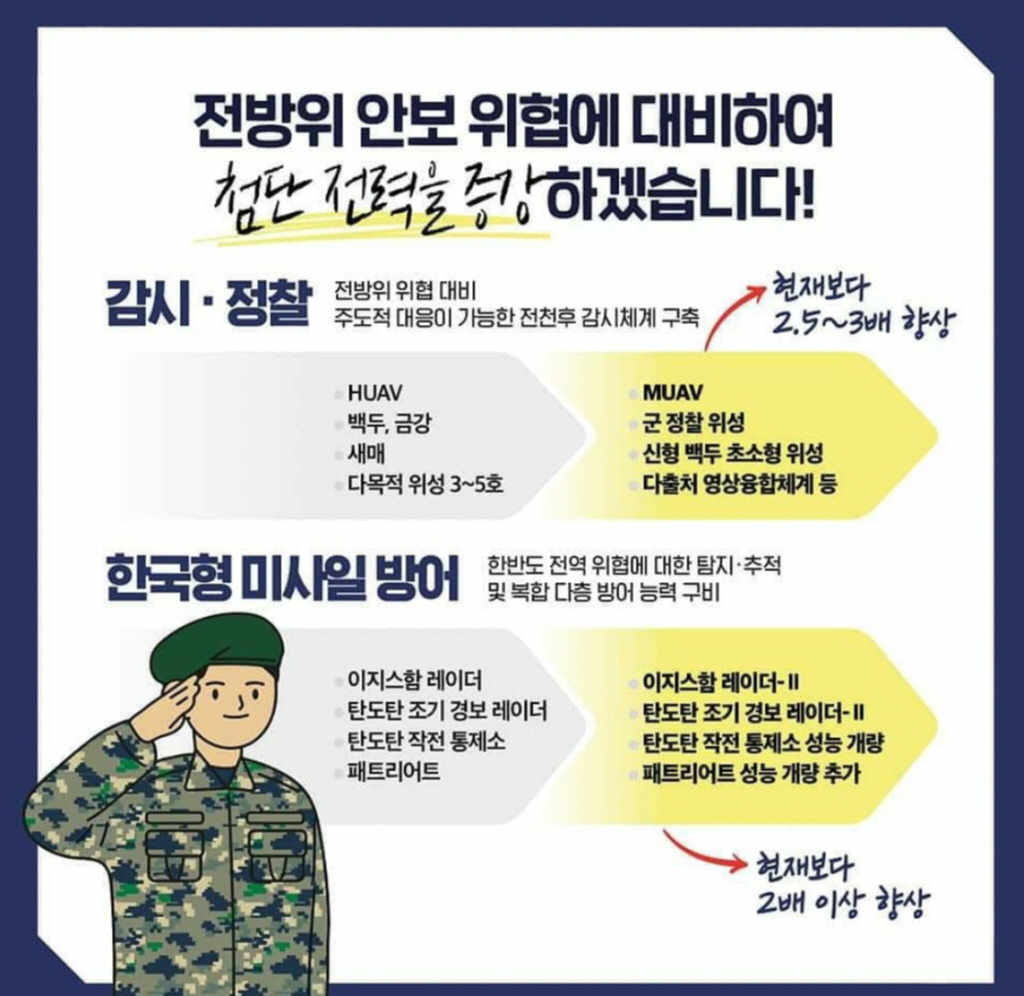 한국방공식별구역(KADIZ)을 포함한 한반도 전역에 대한 24시간 통신과 계기 정보 탐지 공중신호정보수집체계와 군사용 정찰기와 정찰위성 개발, 고체추진 우주발사체를 활용한 초소형 군사용 정찰위성 개발, PAC-3(패트리어트)와 성능 개량된 철매-Ⅱ, L-SAM(장거리 지대공 유도무기) 양산을 통해 수도권 및 핵심 중요시설 방호용 한국형 아이언돔 구축 등이다.