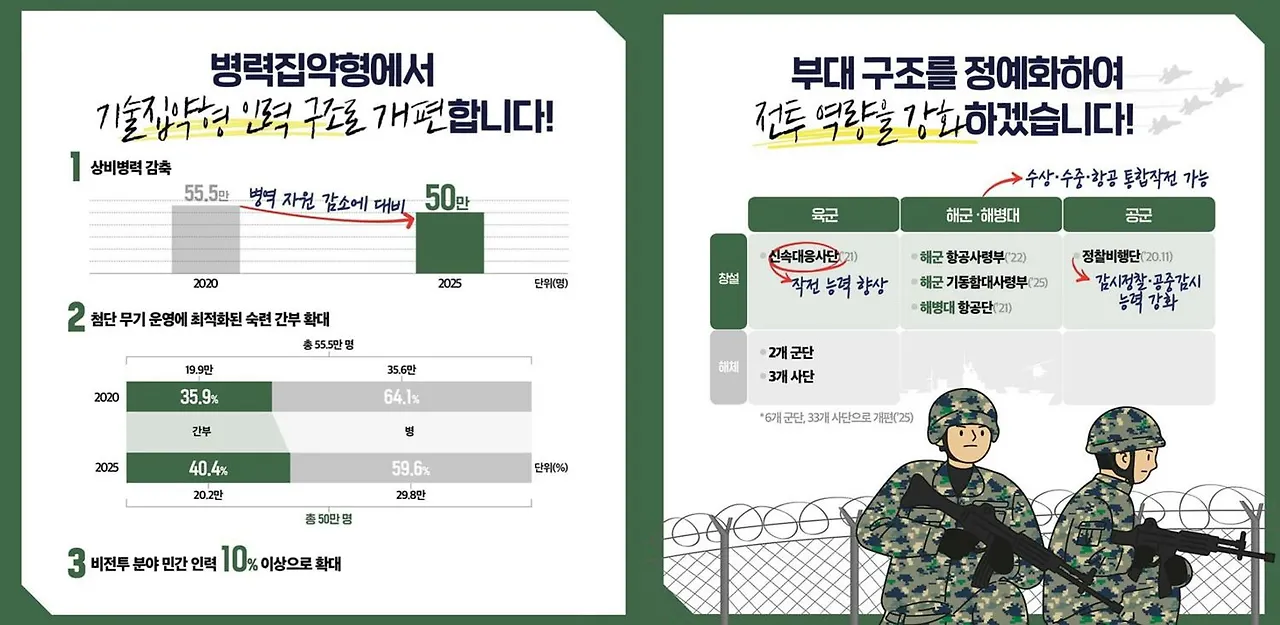 공중 정찰을 통해 획득한 정보를 토대로 연합 및 합동작전으로 적을 일격에 무력화시키는 현대 전장에서 병력 축소를 우려하는 목소리도 있지만, 병력 집약적 구조에서 첨단무기 중심의 기술집약형 구조로 정예화와 유·무인복합전투체계 구축을 통해 위험한 전장 환경에서 작전에 참가하는 지상 및 해상 전투원 생존성 향상도 중요한 대목이다.