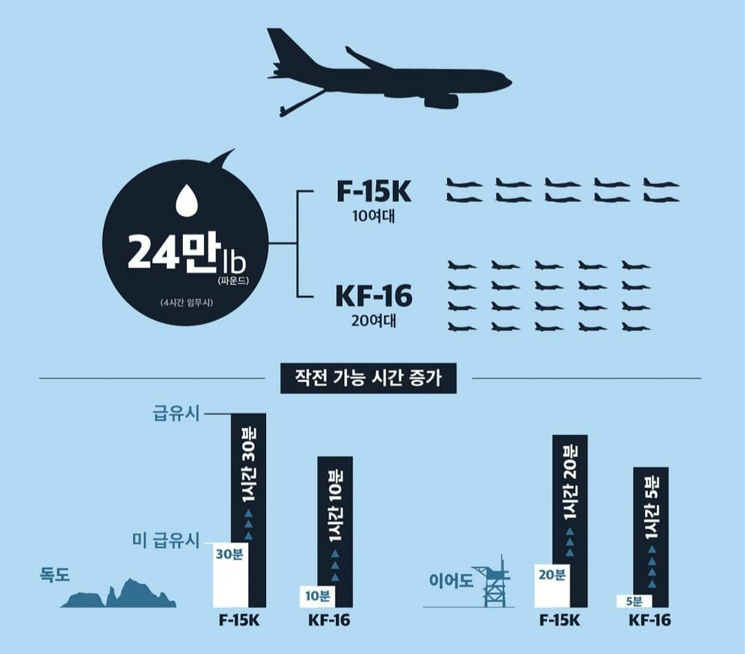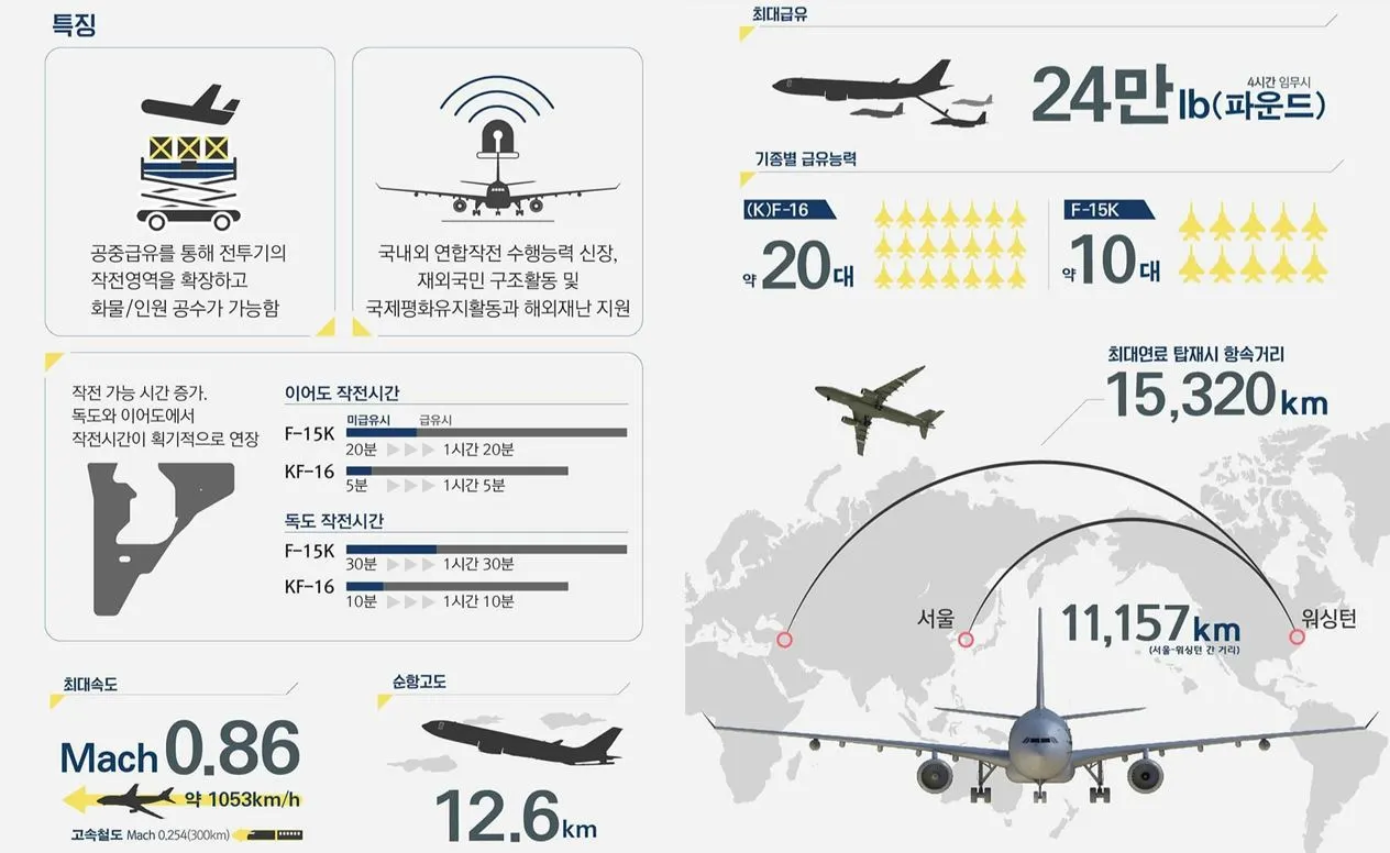 그 동안 동해, 남해, 서해까지 넓은 영역에 비해 F-15K, KF-16, F-35A이 가진 자체 항속거리로는 작전반경과 시간에 제한적이었으나, 공중급유기 도입을 통해 전투기, 수송기, 초계기의 무장 및 화물 탑재량 증가와 작전시간 확대 등으로, 군 방어력의 획기적 증대와 전투력 상승 효과로 이어졌다.