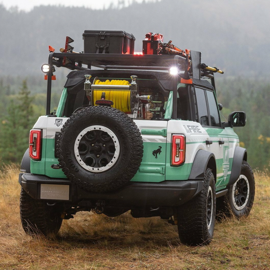 소방장비를 갖춘 ‘와일드랜드 파이어크루’는 아웃도어 브랜드 '필슨'과 공동제작한 미국 국립산림재단을 위한 긴급구호차량으로, 브롱코 4도어 배드랜드를 기반으로 사스콰치 패키지, 내화 소재 실내 인테리어, 모듈식 강철 범퍼 및 윈치, LED 조명바와 펠리칸 케이스가 달린 루프랙, 화재 진압용 물탱크와 고압 워터펌프 등이 탑재됐다.