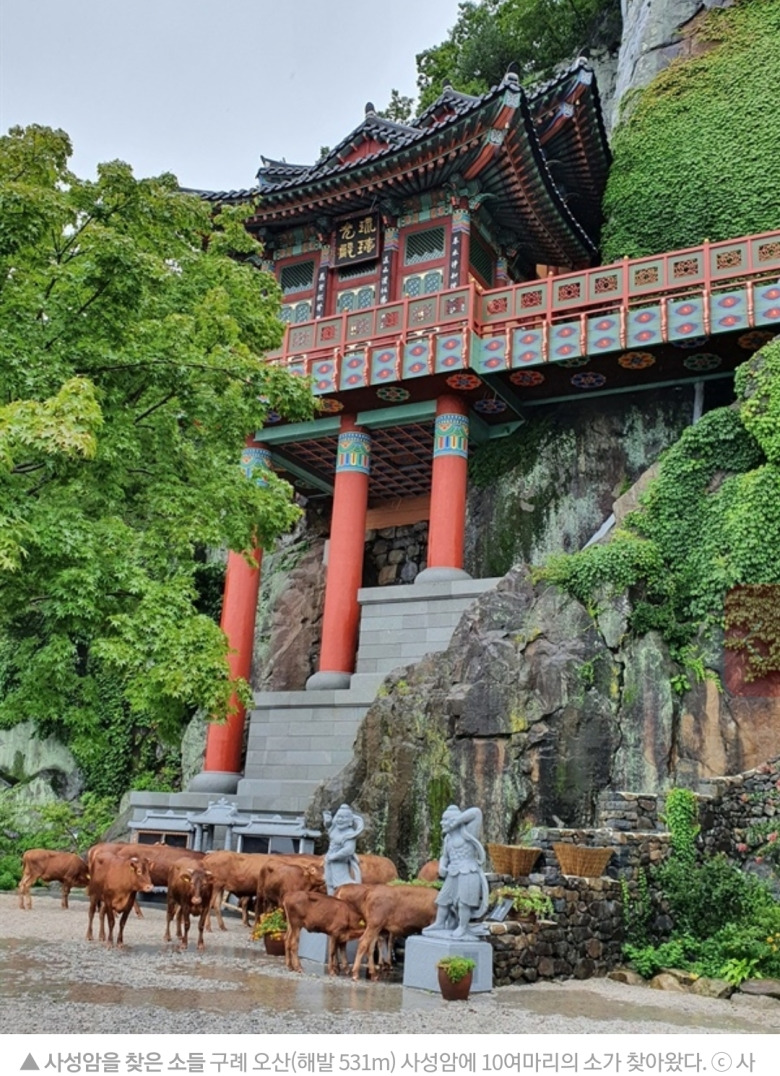 나는 8월 30일 사성암을 찾았다. 오랫동안 불교에 몸담아왔던 습관 때문에 이동 중에 가까운 절이 있으면 들려서 108배를 하는 경우가 많다. 얼마 전 소들이 사성암으로 피신했다는 뉴스를 접하면서 꼭 한 번 사성암에 가보리라는 생각을 했었다. 또한 나 역시 본성을 잃고 살아가고 있는 것은 아닌지 잠시나마 돌아보고 반성의 시간을 가지면서 나의 본모습을 생각해보고 싶었다. 또 소들이 사성암을 찾은 이유를 알 수도 있지 않을까 하여 완도에 가는 길을 조금 돌아서 사성암에 들렀다.