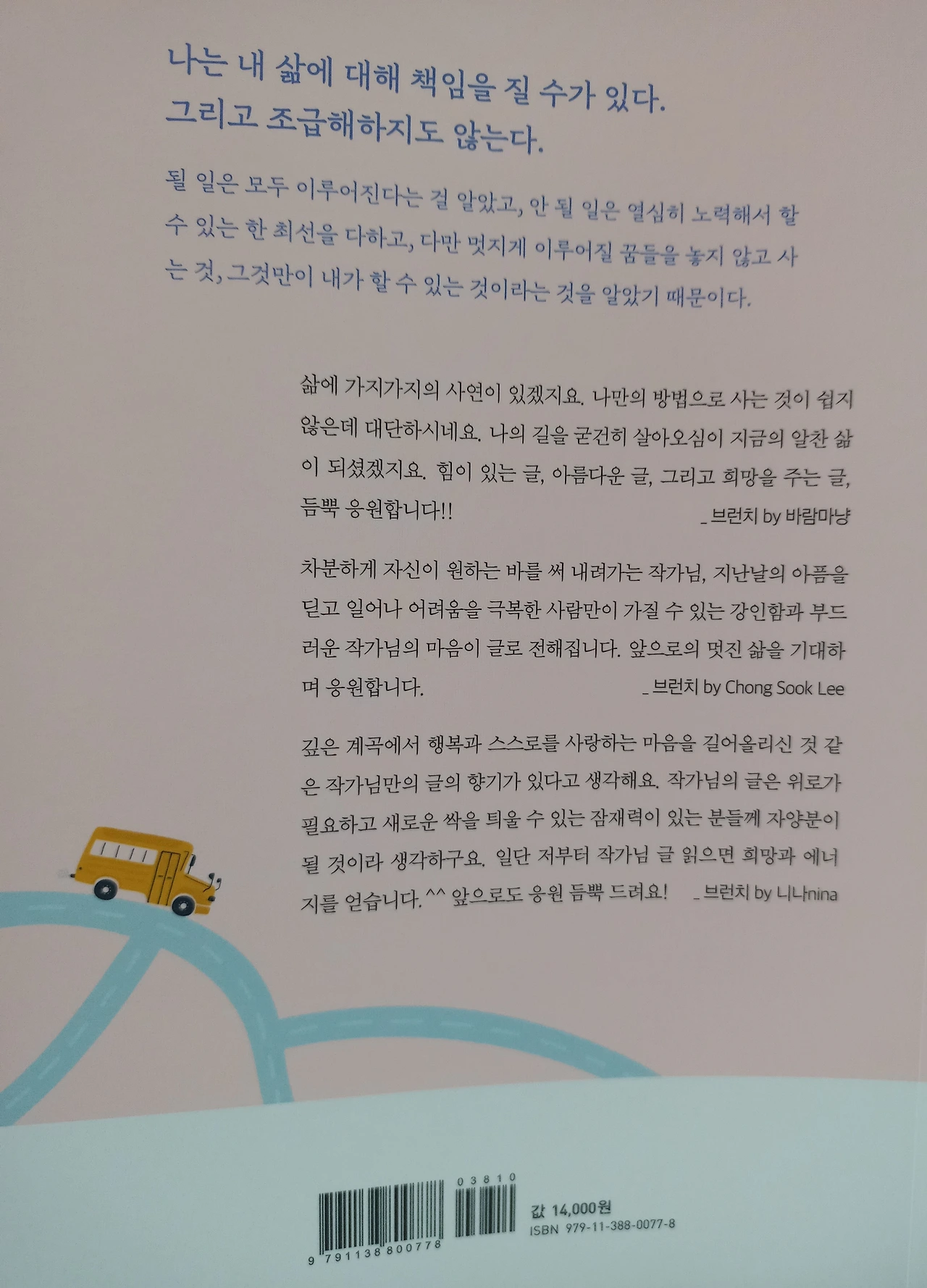 많이 힘들었던 시절들, 힘든 줄도 모르고 원하는 삶을 이루기 위해 불철주야 이를 악물고 살아왔던 내 지나간 삶들을 내 책이 세상을 돌면서 나를 위로하고 있다. 그 위로가 누군가를 행복하게 해 줄 거고, 내게 더 큰 행복으로 다가올 것이기에 서둘러 책으로 엮은 것에 대한 내 용기에 자찬을 해주고 싶다.