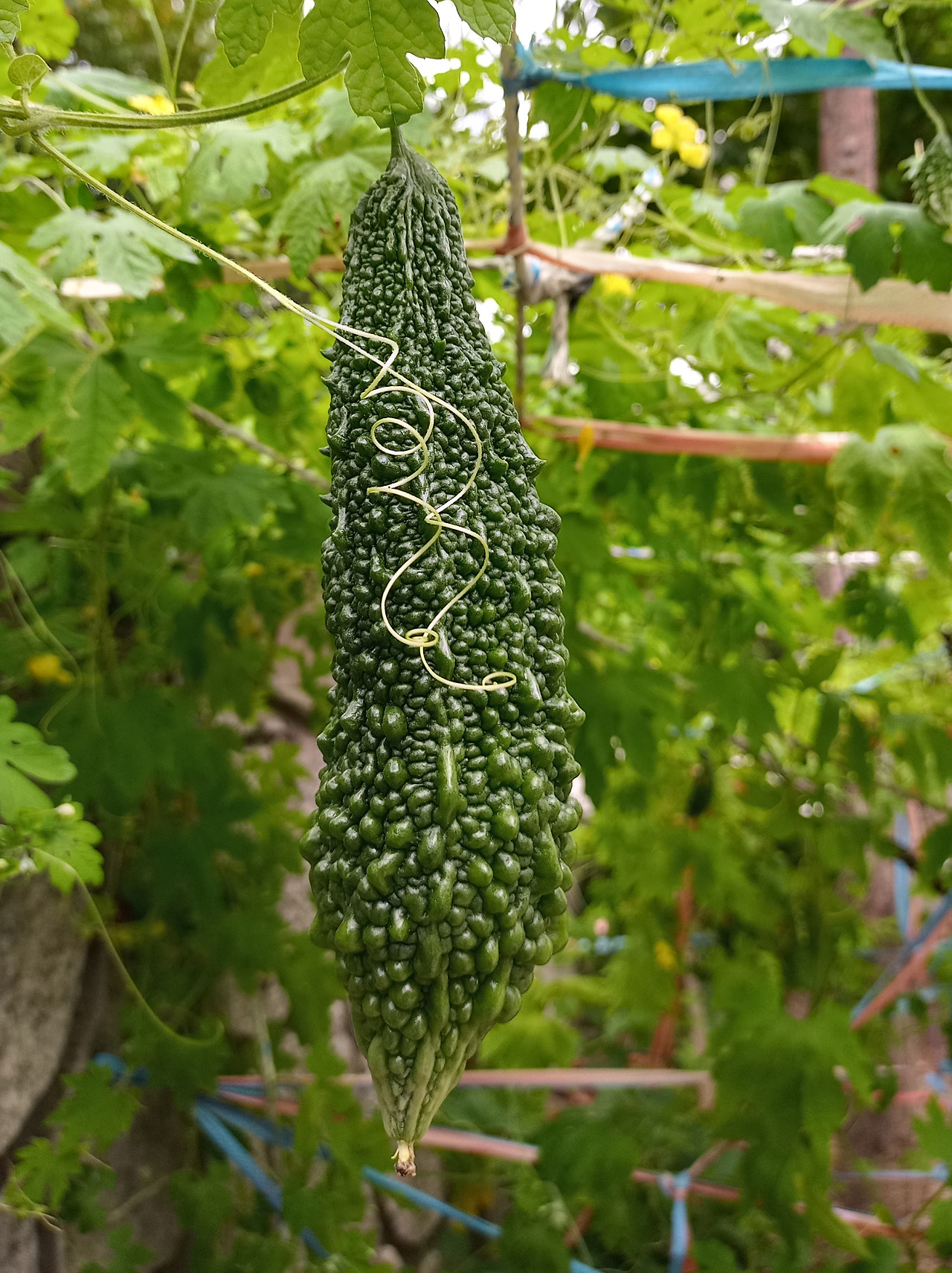 여주는 성인병에 좋다 하여 많이 알려져 있기도 하지만, 특히 당뇨를 앓으시는 분들이 많이들 드시고 있는 것이기도 하다. 생김새는 마치 오이에 물집이 잡힌듯한 모양이다. 처음 심는 거지만 넝쿨이 타고 오르도록 줄만 매어주면 잘 열릴 거라 하시기에 얼른 받아와 심었다.