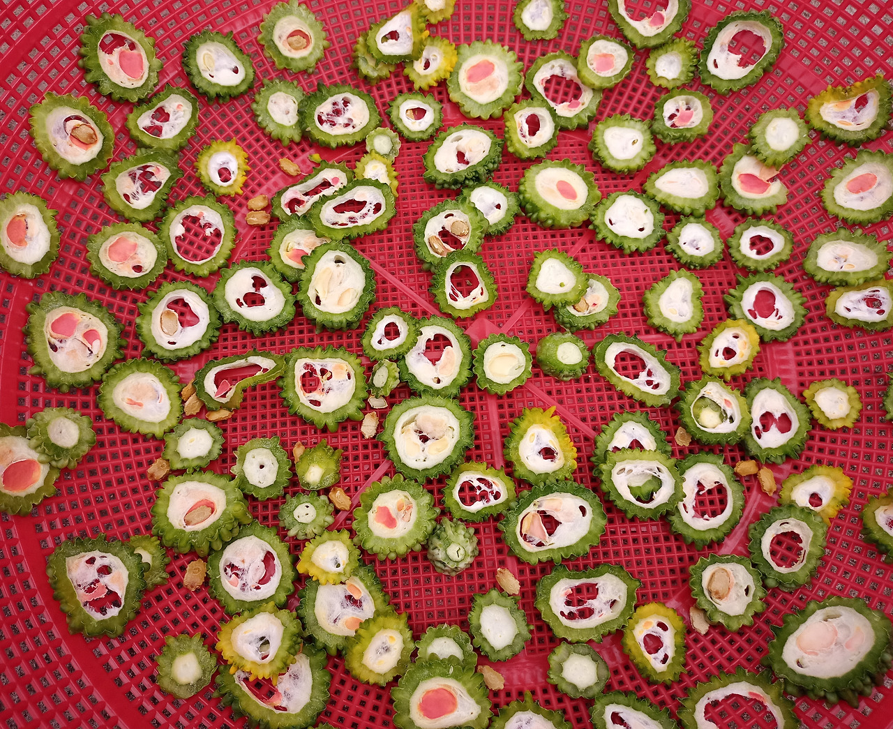 처음 내 밭에서 딴 여주 3개, 잘 마르라고 얇게 썰어서 많아보이지만 아쉽게도 마른 후에는 한 줌밖에 안되었다.