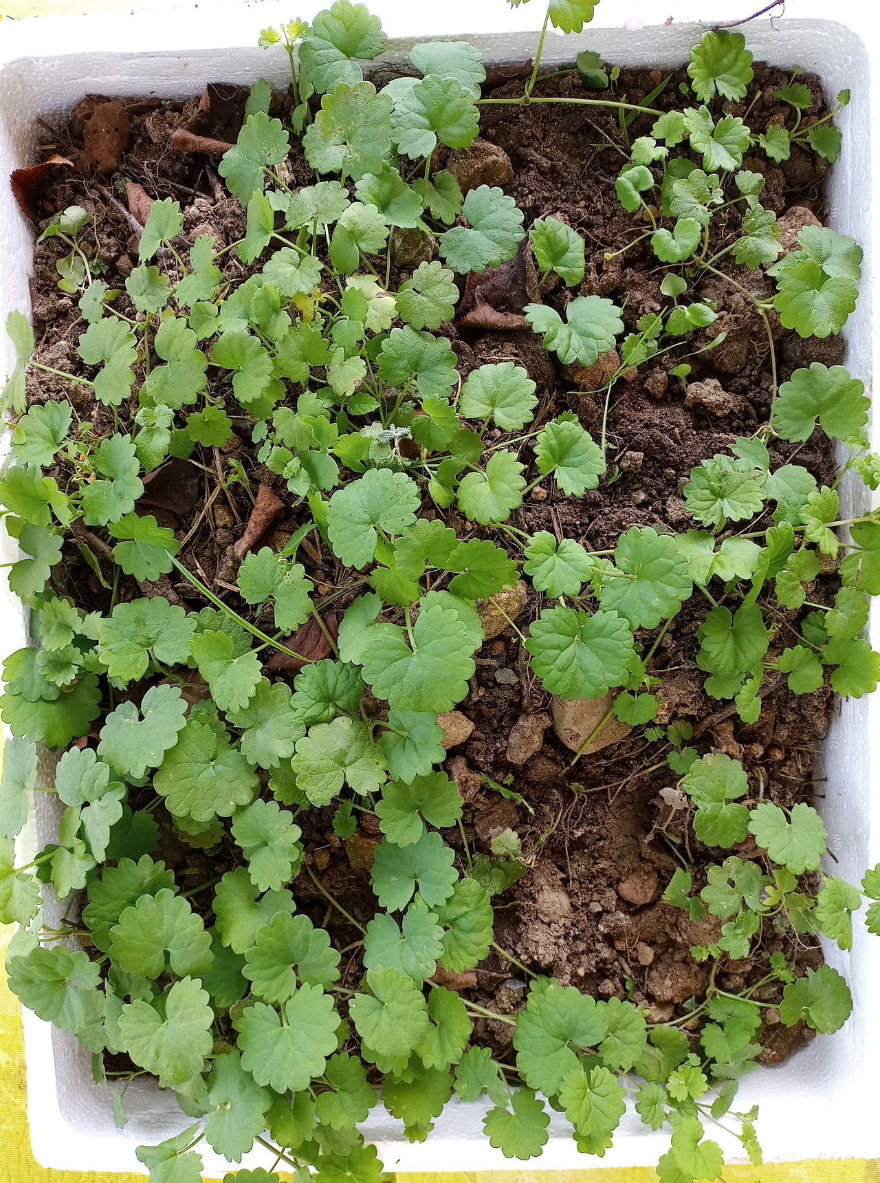왼쪽: 스티로폼에 흙까지 떠서 캐어온 이식용 금전초 / 오른쪽: 완도 집 그늘에 심은 금전초가 자리를 잡고 줄기를 뻗는 모습