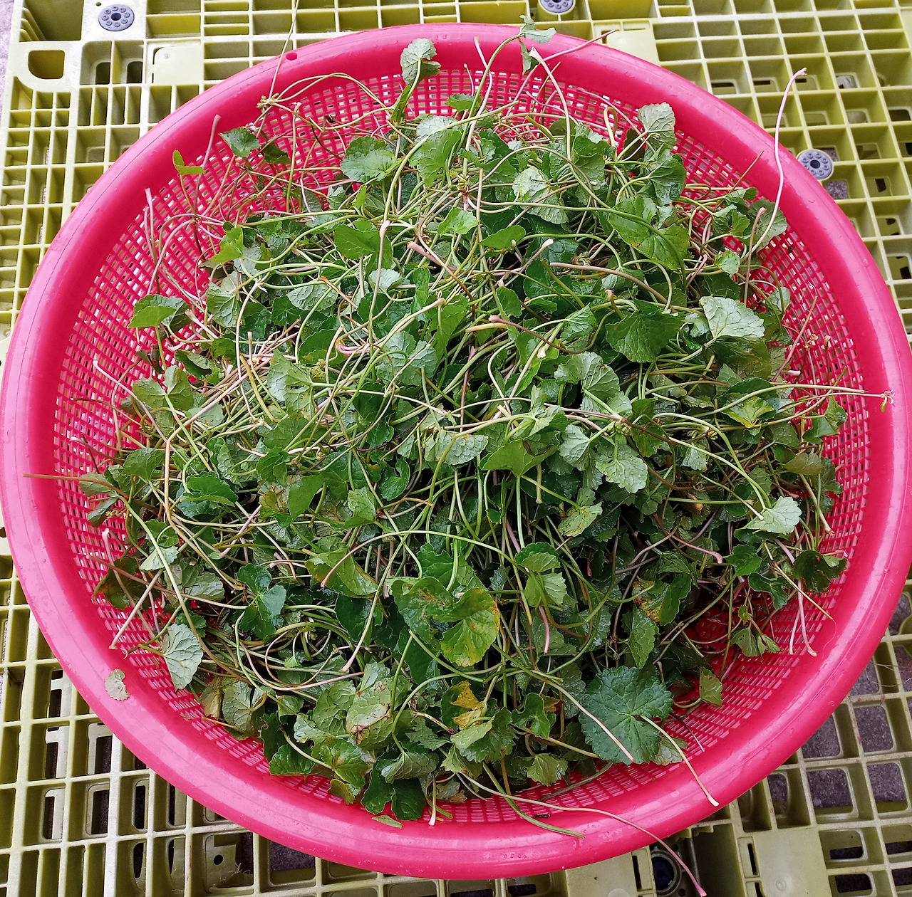 병풀은 다듬으며 보니 아주 연한 풀이었다. 눈으로 보았을 때와는 완전히 다른 부드러움을 갖추고 있었다. 향은 미나리와 어성초의 중간쯤 되는 향기였던 것 같다. 약간은 비릿하면서도 풋풋한 향기가 연하게 났다.