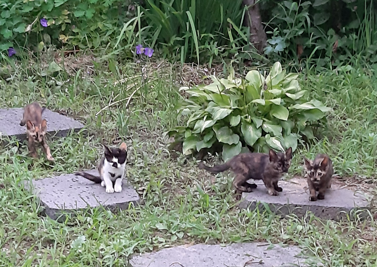 문 앞에 자동차 세우는 소리를 듣고 새끼 고양이들이 모두 마중 나온 것이다.