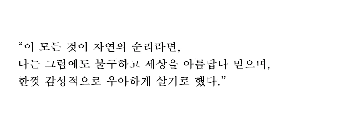 사회에서는 늘 불행하고 험악한 일들이 일어나고 있었다. 내 인생에도 늘 불안한 일, 걱정스러운 일, 슬픈 일들이 일어나고 있었다. 그리고 나이를 한 살 한 살 먹고, 글을 쓰면서 나는 이 모든 것이 여름이 지나- 가을이 오는 것처럼 당연스러운 것. 겪어야 하는 것이라는 걸 깨달았다. 어느 날 출근길, 나는 하늘을 올려다 보며 "이 모든 것이 자연의 순리라면, 그럼에도 불구하고 세상을 아름답다 믿으며, 한껏 감성적으로 살아보겠어."라고 말했다. 어렵고 힘든 상황에 초연해질 수 있다는 건, 지금 이 삶을 아름답게 살기 위해 최선을 다해보고 싶다는 희망을 품게 했다.