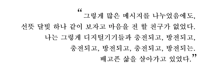 하루에도 수많은 정보를 보고 많은 메시지를 나눈다. 하지만 무엇이든 스위치가 꺼져버리면- 나라는 존재는 유령처럼 투명색으로 버렸다. 각종 사이트에서 수많은 정보를 보았음에도 저녁이면 기억상실증에 걸린 것처럼 텅-비어 버렸다. 종일 많은 메시지를 주고받았는 대도 선뜻 달빛 하나 같이 보자고 마음을 전 할 친구가 없었다. 나는 그렇게 디지털 기기들과 충전되고/ 방전되고/ 충전되고/ 방전되는/ 배고픈 삶을 이어가고 있었다.