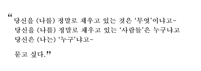 당신을 정말로 채우고 있는 것은 '무엇'이냐고- 묻고 싶다. 당신은 누구냐고. 백 명, 천 명도 넘는 팔로워를 가지고 있어도 평범한 어느 날 외롭다고 느낀 적은 없었는지. 당신을 채우고 있는 사람들이 누구인지 묻고 싶다.