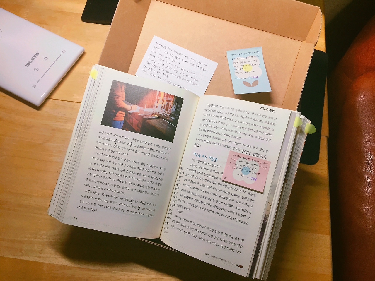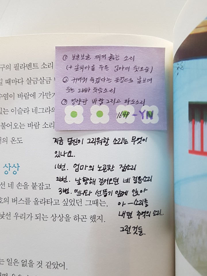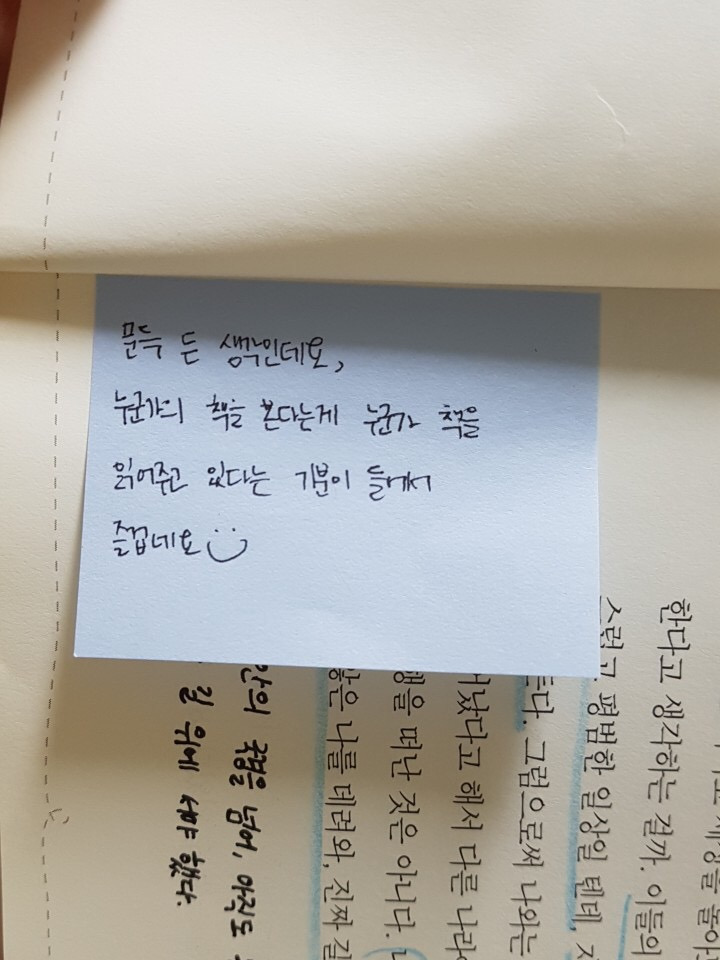 유나 - 이미 읽어본 책임에도 두근두근 비밀노트를 펼쳐보는 것처럼 설레었어요. 아마도 마음 꼭 맞는 사람들과 같이 읽는다는 생각에 그런 것 같아요. 노트를 꺼내 뭔가를 한없이 긁적이면서 다시 책을 읽어볼래요.