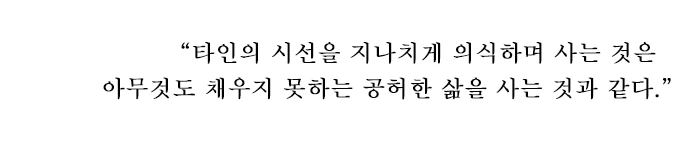 나 또한 약 2년 전까지만 해도 SNS을 열심히 하는 사람이었다. 인증샷과 셀카를 찍어 올렸고 댓글을 읽으며 안심하고 좋아했었다. 하지만 어느 순간 내가 SNS을 하며 타인의 시선을 너무 의식하고 있다는 생각이 들었다. 마치 중학생 시절 사람들이 다 나만 쳐다본다고 착각해서 소풍 가기 전 옷을 서른 벌이나 갈아입고 나가 쭈뼛쭈뼛 행동하는 것과 같았다. 그러나 스타가 아닌 한 사람들은 자신의 삶을 살아가기 바쁘기 때문에 타인에게 크게 관심이 없다. 결국 타인의 시선을 지나치게 의식하며 사는 것은 아무것도 채우지 못하는 공허한 삶을 사는 것과 같다.