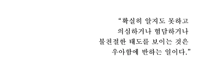 타인이나 다른 분야에 대해 무지한 것은 나의 탓이다. 확실히 알지도 못하고 의심하거나 험담하거나 불친절한 태도를 보이는 것은 우아함에 반하는 일이다. 사람과 사람이 어우러져 사는 사회에서는 현명한 우아함이 필요하다. 100% 모두를 믿고 친절하게 대하라는 것이 아니라, 선택은 본인이 현명하고 신중하게 진행하되, 사람들의 노력들에 친절한 태도로 임하면 더 좋은 혜택을 받고도 우아함을 지킬 수 있다는 것이다(이것은 상대방의 태도가 불쾌하거나 예의 없지 않은 경우에 해당된다). 친절한 말투, 친절한 표정, 현명한 태도가 좋은 운을 만드는 핵심 재료들이 아닐까. 나는 처음으로 누군가의 도움 없이, 그리고 속았다는 기분 없이 좋은 서비스를 받으며 휴대폰을 고칠 수 있었다. 참 운이 좋은 날이었다.