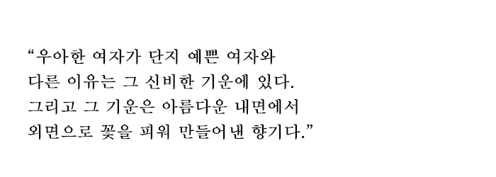 우아한 여자에게는 우리가 일종의 'aura(아우라)'라고 부르는 기운이 느껴진다. 그 고고한 분위기는 어디서 나오는 것일까. 우아한 여자가 단지 예쁜 여자와 다른 이유는 그 신비한 기운에 있다. 그리고 그 기운은 아름다운 내면에서 외면으로 꽃을 피워 만들어낸 향기다. 오드리 헵번은 이런 명언을 남겼다. '아름다운 자세를 갖고 싶으면 결코 너 자신이 혼자 걷고 있지 않음을 명심해서 걸어라. 아름다운 입술을 갖고 싶으면 친절한 말을 하라. '