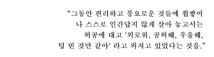 그동안 편리하고 풍요로운 것들에 휩싸여 나 스스로 인간답지 않게 살아 놓고서는 허공에 대고 '외로워, 공허해, 우울해, 텅 빈 것만 같아'라고 외치고 있었다는 것을.