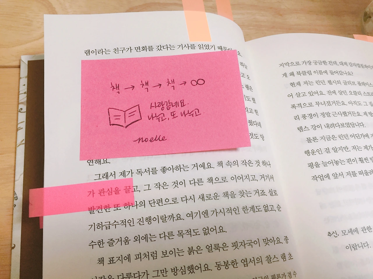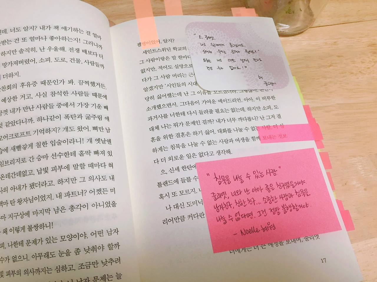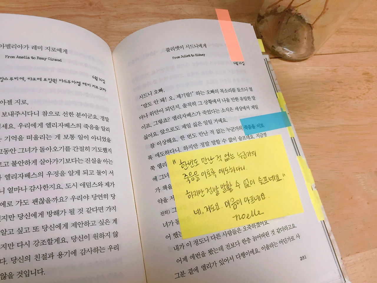 저는 중간중간 등장인물들에게 말을 거는 기분으로 메모를 남겼어요. 책을 읽으며 너무 행복했던 순간이 많아서 어쩐지 보내기 아쉬운 마음도 있지만, 책을 기다리던 제 마음과 같이 기다리고 계실 노엘님을 위해 내일 바로 보내드리겠습니다. :) - 꿈고양이