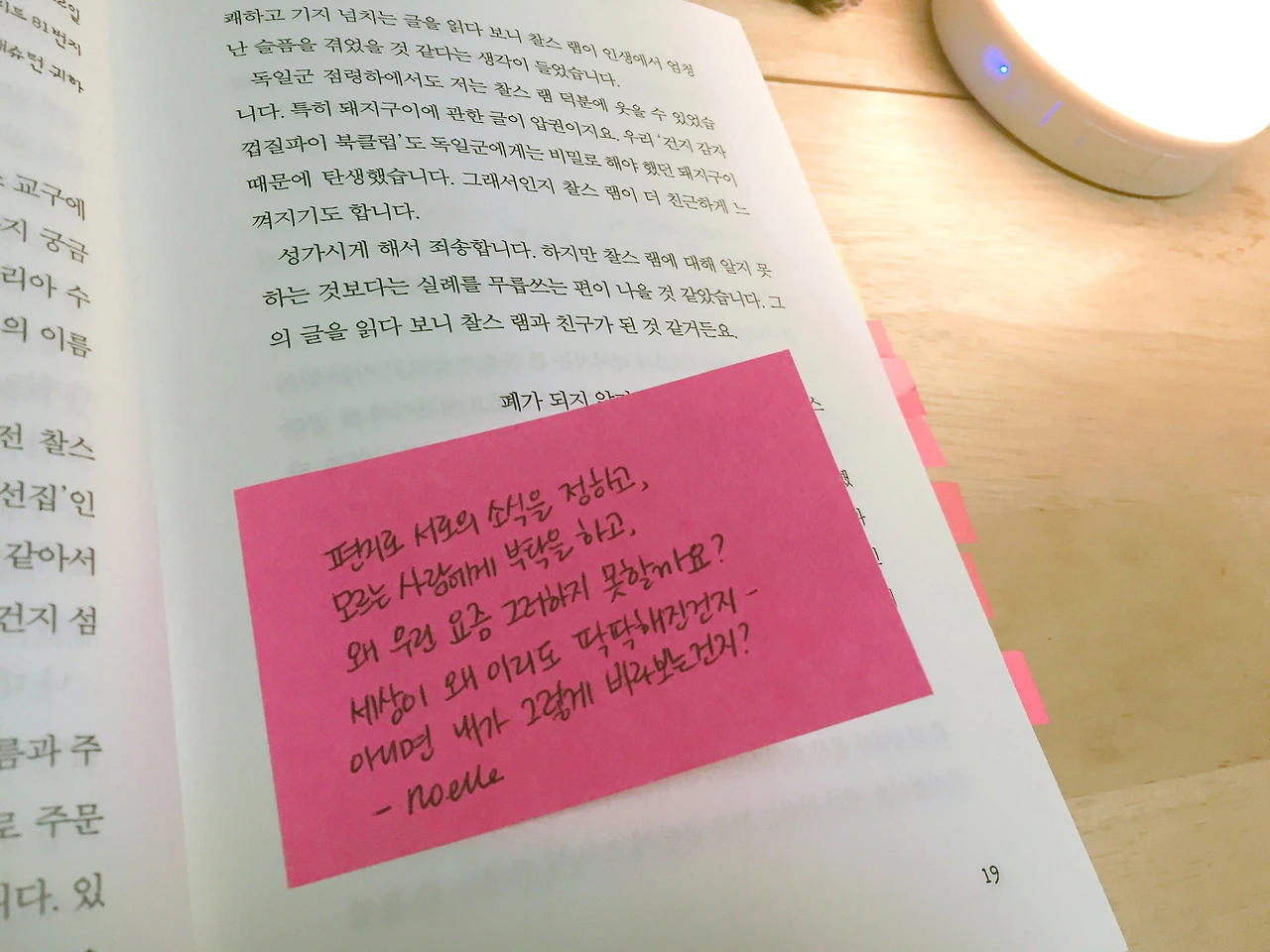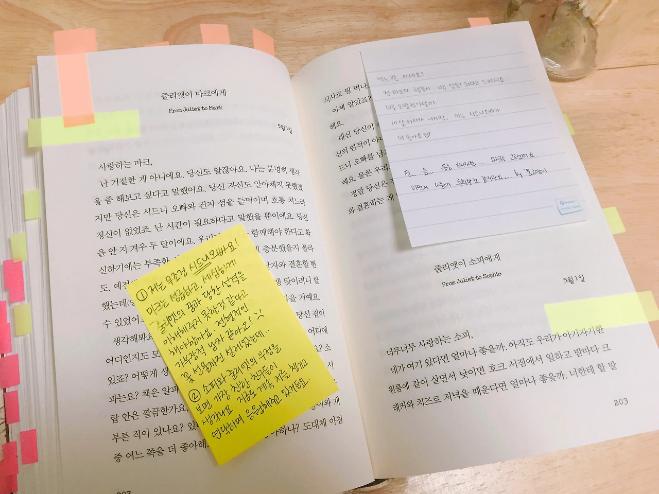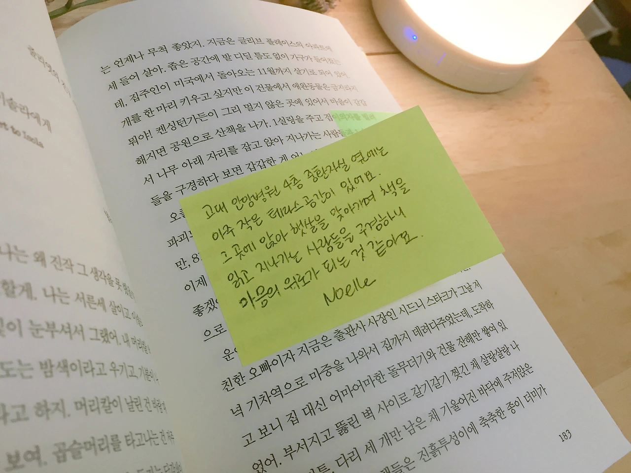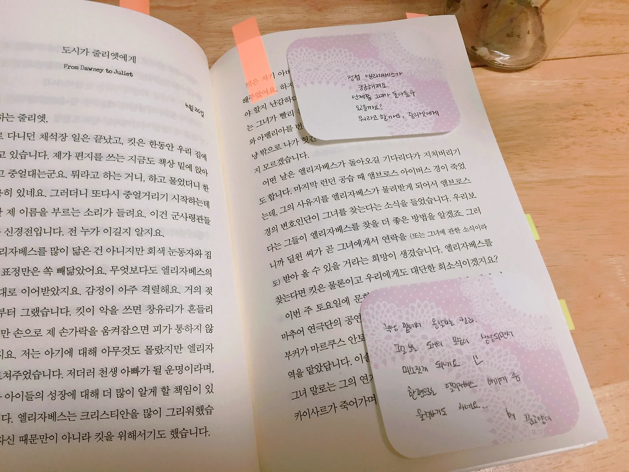 저는 중간중간 등장인물들에게 말을 거는 기분으로 메모를 남겼어요. 책을 읽으며 너무 행복했던 순간이 많아서 어쩐지 보내기 아쉬운 마음도 있지만, 책을 기다리던 제 마음과 같이 기다리고 계실 노엘님을 위해 내일 바로 보내드리겠습니다. :) - 꿈고양이