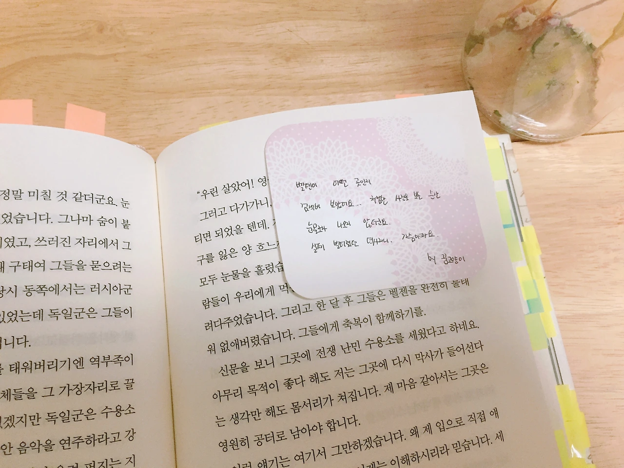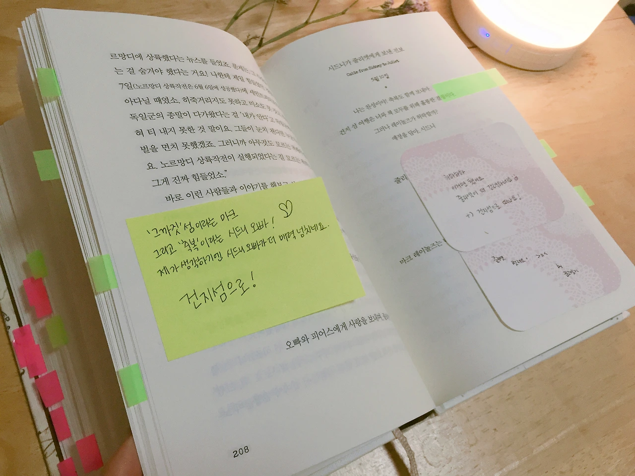 눈물이 핑- 돌았다. 아버지의 소식에 지금의 나보다 몇 배는 빨리 뛰었을 그녀의 심장 소리가 들리는 듯했다. 그리고 불편한 마음과 자세로 중환자실, 수술 대기실에 앉아 연두색 포스트잇을 붙이며 이야기로 슬픔을 이겨내고 있는 모습이 눈에 보였다. 건지 섬 주민들과 힘겨운 수술을 이겨내 주신 그녀의 아버지에게 정말 감사하다고 말하고 싶어 졌다.