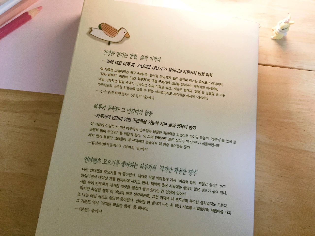 나의 글을 읽는 분들과 편지를 주고받으면서, 나는 그들이 나와 많이 닮았다는 것을 느꼈다. 그래서, 하루키임에도 불구하고, 그래서 모두들 읽었을지 모르겠다는 불안감이 엄습함에도 불구하고, 이 책이 소중해서 함께하고 싶다고 용기를 냈다. 하루키가 어떤 속옷을 입는지 알 정도로 이 책을 여러 번 읽고 있은 나와 같은 이가 있을 수 있다는 생각에. 또 처음 접하는 분이라면 더욱이 소소하고 그래서 소중한 삶을 오롯이 느껴볼 수 있을 것이란 생각에 말이다.