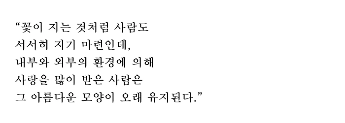 모든 여인들은 영원히 아름답길 원한다. 자신에게 주름이 생기고 흰머리가 나는 것을 환영하는 이는 없다. 나이 드는 것을 받아들이기 힘들어 성형의 유혹에 빠지는 여인들도 많다. 꽃은 지면서 서서히 향이 사라지는데 빛이 잘 들고 바람이 잘 통하는 곳에 걸어두면 향도 쉽게 가시지 않고 꽃 모양도 아름답게 유지된다. 사람도 같다. 사람도 서서히 지기 마련인데, 내부와 외부의 환경에 의해 사랑을 많이 받은 사람은 그 아름다운 모양이 오래 유지된다.