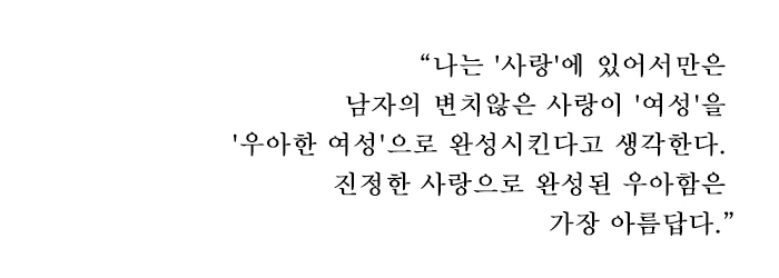 나는 '점점 나이가 들면서 이것저것 따지느라 남자 만나기 힘들다'라는 말을 몸소 체험하고 있다. 결혼식에 갈 때마다 어떻게 저 남자를 남편으로 어떻게 저 여자를 아내로 맞이하겠다고 결심했을까?라고 궁금증이 들기도 한다. 그냥 신용카드로 결제하듯 눈 꾹 감고 하는 것일까. 생각해보면 사랑이라는 것은 너무나 위험하고, 너무나 아름다운 것이다. 많은 여자들이 사랑 앞에서 심하게 흔들리고 울고, 실패한다. 나는 '사랑'에 있어서만은 남자의 변치 않은 사랑이 '그냥 여성'인 사람을 '우아한 여성'으로 완성시킨다고 생각한다. 진정한 사랑으로 완성된 우아함은 가장 아름답다. 여자들은 여전히 사랑을 찾고, 믿어보고, 식장에 떨리는 발을 내딛는다. 그것이 세상에서 가장 아름다운 우아함으로 향하는 길임을 알기에- 많은 여성들이 또 다시 위험한 곡예를 오르는 것일지도 모른다.