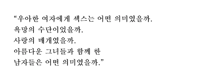 우아한 여자에게 섹스는 어떤 의미였을까. 욕망의 수단이었을까. 사랑의 매개였을까. 아름다운 그녀들과 함께 한 남자들은 어떤 의미였을까.