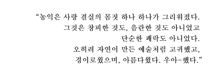 차가 어디론가 멀리 멀리 사라졌지만, 여자는 한참 자리에 서 있었다. 사랑이 없는 키스를 한 것은 처음이었다. 그건 즐겁지도 쾌락적이지도 않았다고 느꼈다. 힘이 빠져 기대 앉아 있는 여자는 갑자기 옛사랑이 너무 보고 싶어 졌다. 사랑이 깃들어 있던 모든 순간들이 그리워졌다. 농익은 사랑의 결실, 그 몸짓 하나 하나가 그리워졌다. 그것은 창피한 것도, 음란한 것도 아니었고 단순한 쾌락도 아니었다. 오히려 자연이 만든 예술처럼 고귀했고, 경이로웠으며, 아름다웠다. 우아-했다.