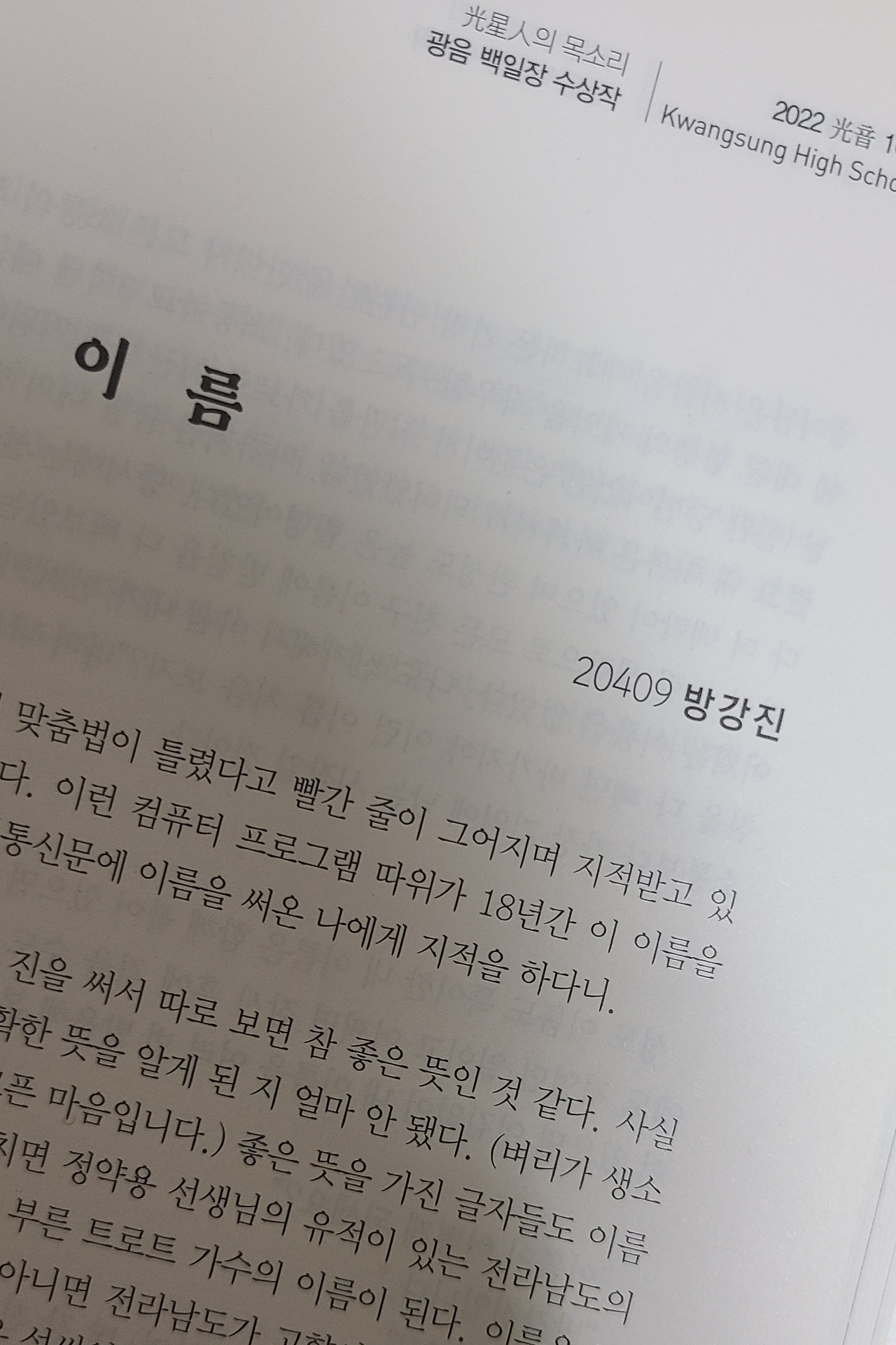 앞으로는 내 이름에 특이하다는 표현보다는 특별하다는 표현을 해주고 싶다. 세상 모든 사람의 이름은 특별하다. 이름을 지으려 고민했던 시간부터 이름 덕분에 생긴 깨달음까지 사람마다 모두 다른 추억이 담겨있으니까. 이름은 당신을 좋아해서 평생을 따라다닌다. 그러니 모두 자신의 이름을 사랑했으면 좋겠다. 나를 이루는 모든 것들 중, 아주 조용하고도 평범히 나를 곁에서 지켜주는 게 이름일 테니.