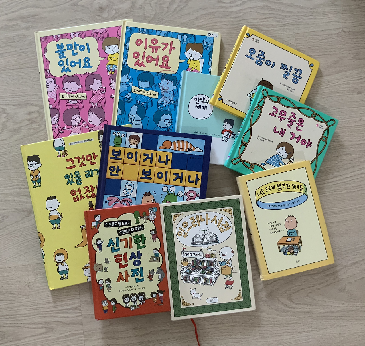 그리고 저학년용 그림책이 책 확장의 도구가 될 수도 있다. 아직까지 글이 많은 책을 읽히기 어렵다고 아이가 좋아했던 그림책들을 다 버리지는 말자. 나도 꽤 비웠는데 버릴 수 없는 책들이 있다. 작가에게 사인받은 책, 그리고 좋아하는 작가의 책들이다. 우리 가족은 '요시타케 신스케' 작가를 좋아한다. 이 작가의 책에는 독특함, 상상력, 참신함, 깊고 넓은 사고력이 담겨있기 때문이다. 대체로 글이 별로 없는 책이지만 볼 때마다 귀엽고 재밌다. 어처구니없는 발상에 실소도 나온다. 이게 이 작가의 매력이다. 우리 아이들도 이 작가를 좋아해서 아직까지도 간직하고 있고 가끔 꺼내 읽는다. 아이들이 이런 어린이책을 좋아한다고? 한숨만 쉬지 말고 그 부분에서 시작하자. 요시타케 신스케의 그림책들을 물론 난도가 낮은 책이지만 그 작가를 좋아한다면 삽화만 들어간 다른 책들을 찾아낼 수도 있다. 아니면 좋아하는 작가가 있다면 그 작가의 다른 책으로 확장시킬 수 있는 발판이 된다. 요시타케 신스케는 그림책만 쓴 것이 아니라 '나도 모르게 생각한 생각들'이나 '살짝 욕심이 생겼어' 같은 에세이도 몇 편 썼는데, 아이들을 이야기책이 아닌 에세이도 읽을 수 있게 하는 발판이 되었다. 그리고 엄마가 아 요시타케 신스케 작가가 신작 냈네, 이 책 사볼까? 하면 아이들은 대부분 그림책을 연상하기에 그래. 하고 흔쾌히 대답하게 된다. 그리고 귀여운 그림이 어쨌든 드문드문 있으므로 한 번은 펼쳐볼 것이다. 그리고 뭐야 그림책 아니네 하고 읽지 않더라도 작가에 대한 호감이 있으므로 꺼내 펼쳐볼 확률이 매우 크다. 다른 유명한 동화작가들도 그렇다. 중고학년용 동화를 쓰는 작가도 있을 테고 혹은 어른용 책을 주로 쓰는데 동화를 가끔 내는 작가도 있다. 그런 작가를 아이들이 좋아하게 된다면 책을 읽는 범위를 넓혀주는 좋은 계기가 될 것이다.