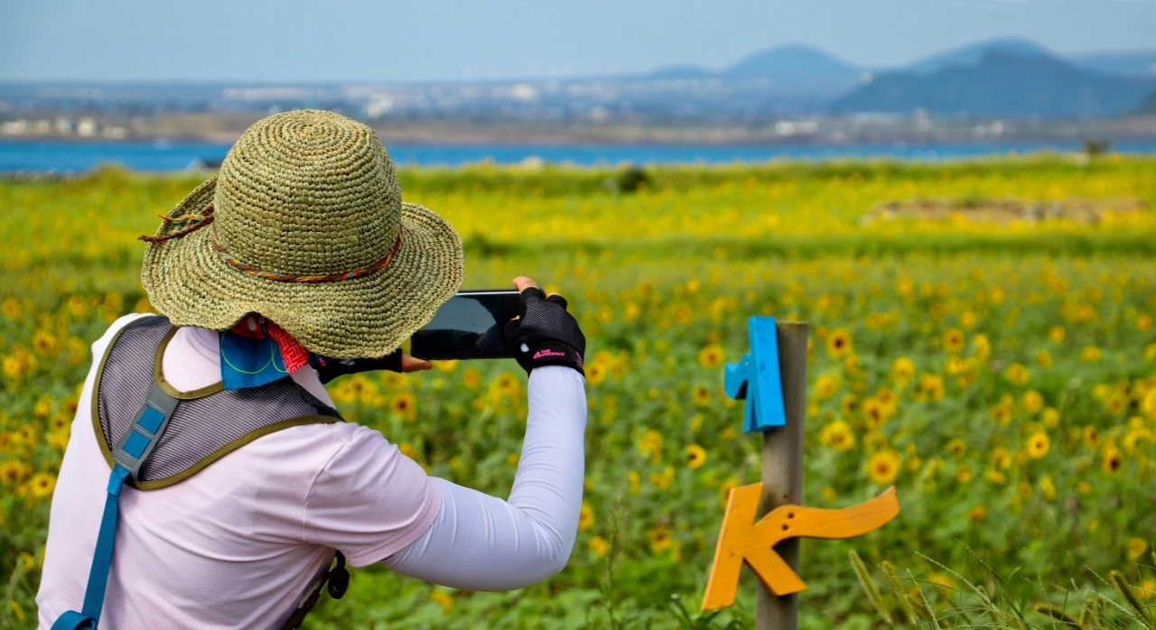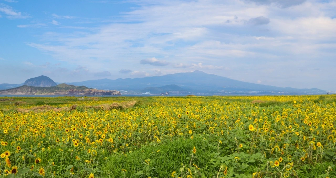바다 건너 한라산과 산방산과 어우러진 해바라기(출처:제주올레 총동문회)