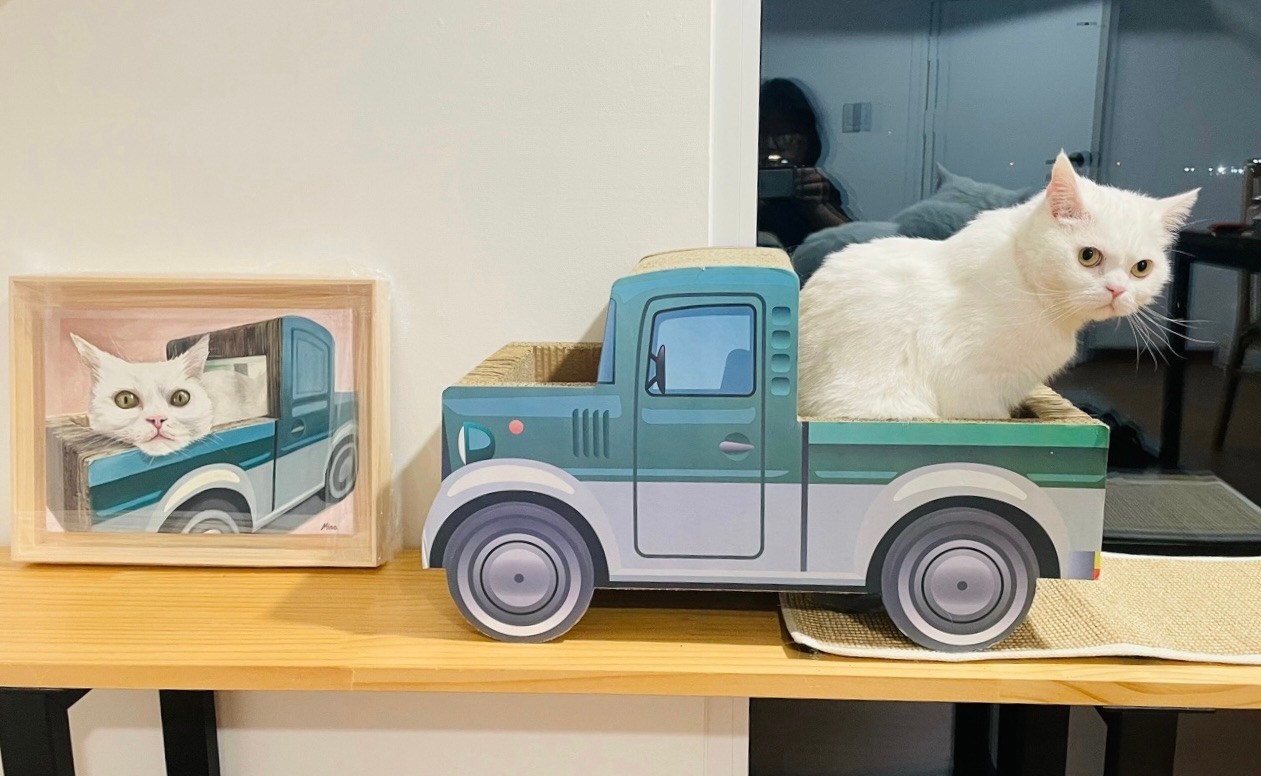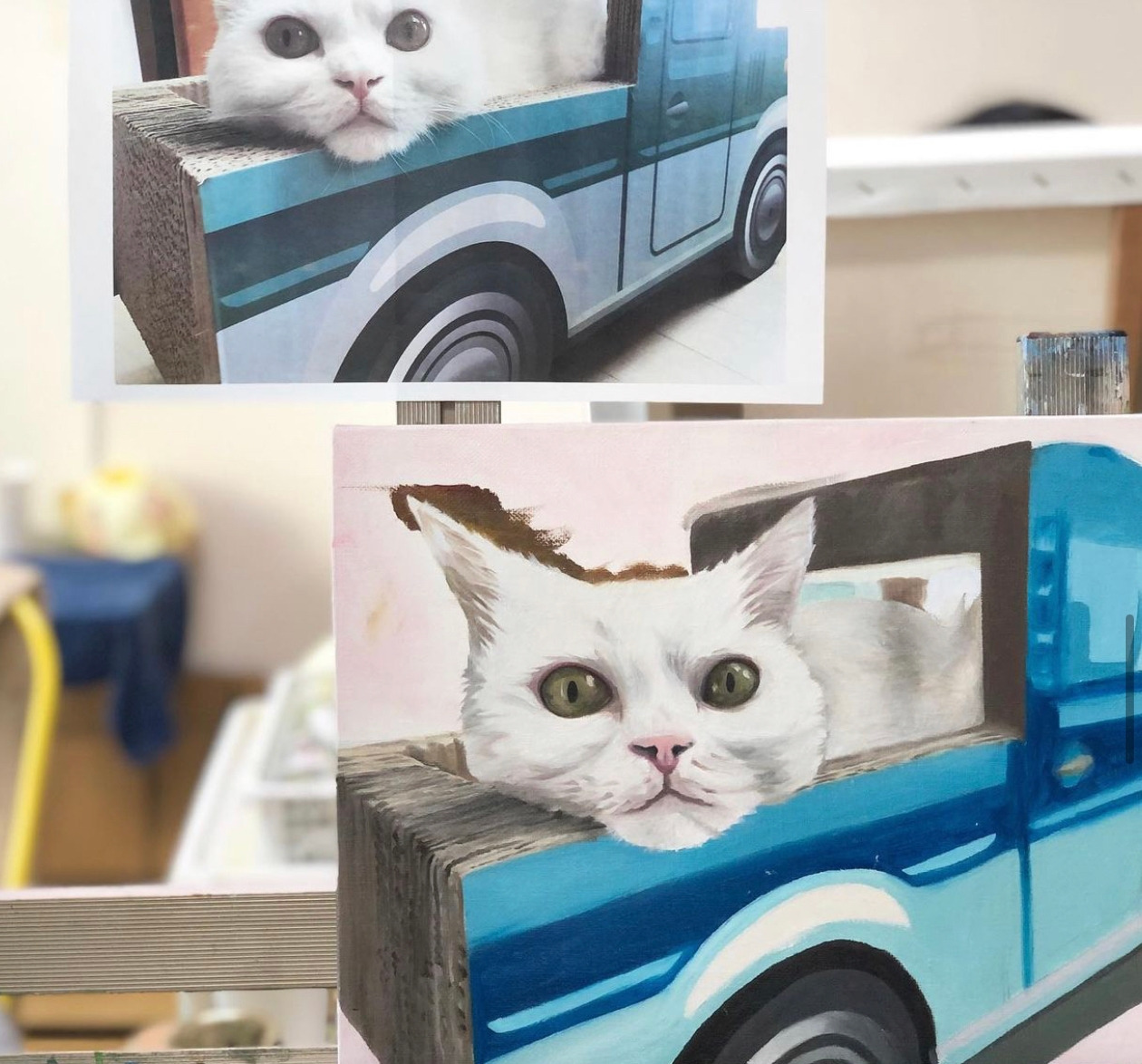 작업 과정 내내 강아지 숑이만큼이나 흰색으로 색 선택이나 털 묘사에 커다란 어려움을 선사한 코루. 결국 부담스러운 마음에 얼굴에 붓질은 미뤄두고 몸통 컬러와 씨름하고 있으면 미술 선생님은 약간은 날카로운 말투로 “얼굴이 김태희, 정우성이에요! 얼굴부터 해주세요” 그랬다. 코루는, 누가 봐도 대한민국 톱클래스 미모의 냥이였던 것이다.