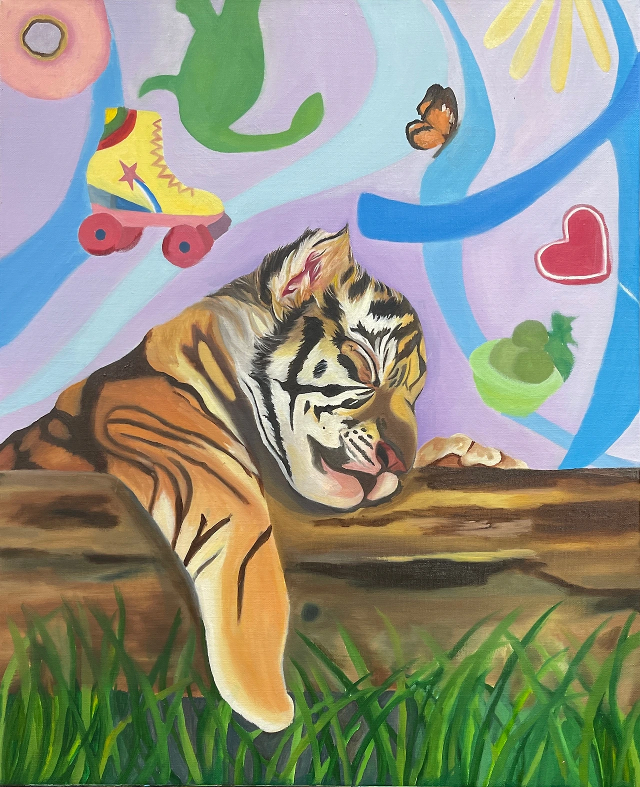 녹차 아이스크림과 들꽃, 공룡인형, 롤러스케이트와 핑크 도넛과 사탕을 좋아하는 아기호랑이가 나무기둥에 기대 잠들어 있다. 뭔가 좋은 꿈을 꾸는 듯한 표정이다. 혹 나비가 된 건가. 나비가 된 듯한 아기호랑이의 꿈. 그야말로 호접몽이다.