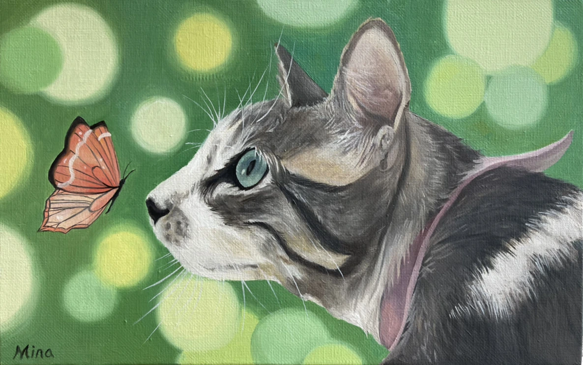 나비는 예전에 그린 아프리카 고양이 수푸의 친구 나비와도 색을 맞춰, 연작의 느낌을 주었다. 배경으로는 옅은 보라색을 선택했다. 칸딘스키는 보라색을 어떤 병적인 상태인 슬픔을 간직한 색으로, 천경자 화백은 신비한 환상과 우울하고 고독한 양가적 감정이 종합된 것이라고 했다. 누가 뭐라든 환상을 표현하기에 가장 적합한 색은 보라가 아닐까 싶다.