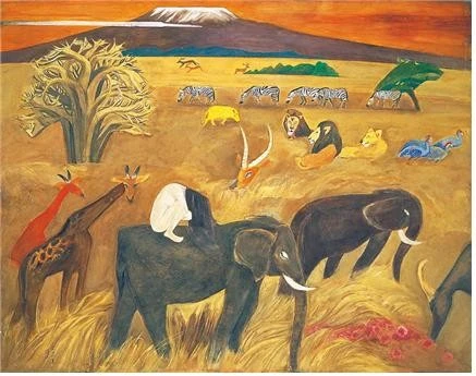 천경자 화백의 <내 슬픈 전설의 49페이지>라는 작품은 아프리카 여행에서 만난 킬리만자로산의 노을 진 배경으로 얼룩말, 사자, 기린, 코끼리, 사슴 등 동물들이 노란 들판에 있다. 이색적인 풍광을 담은 풍경화지만, 즐겁기보다는 뭔가 침울하다. 특히 코끼리 등에 쪼그려 않은 여인은 머리카락으로 얼굴을 가리고 울고 있는 것처럼 보인다.