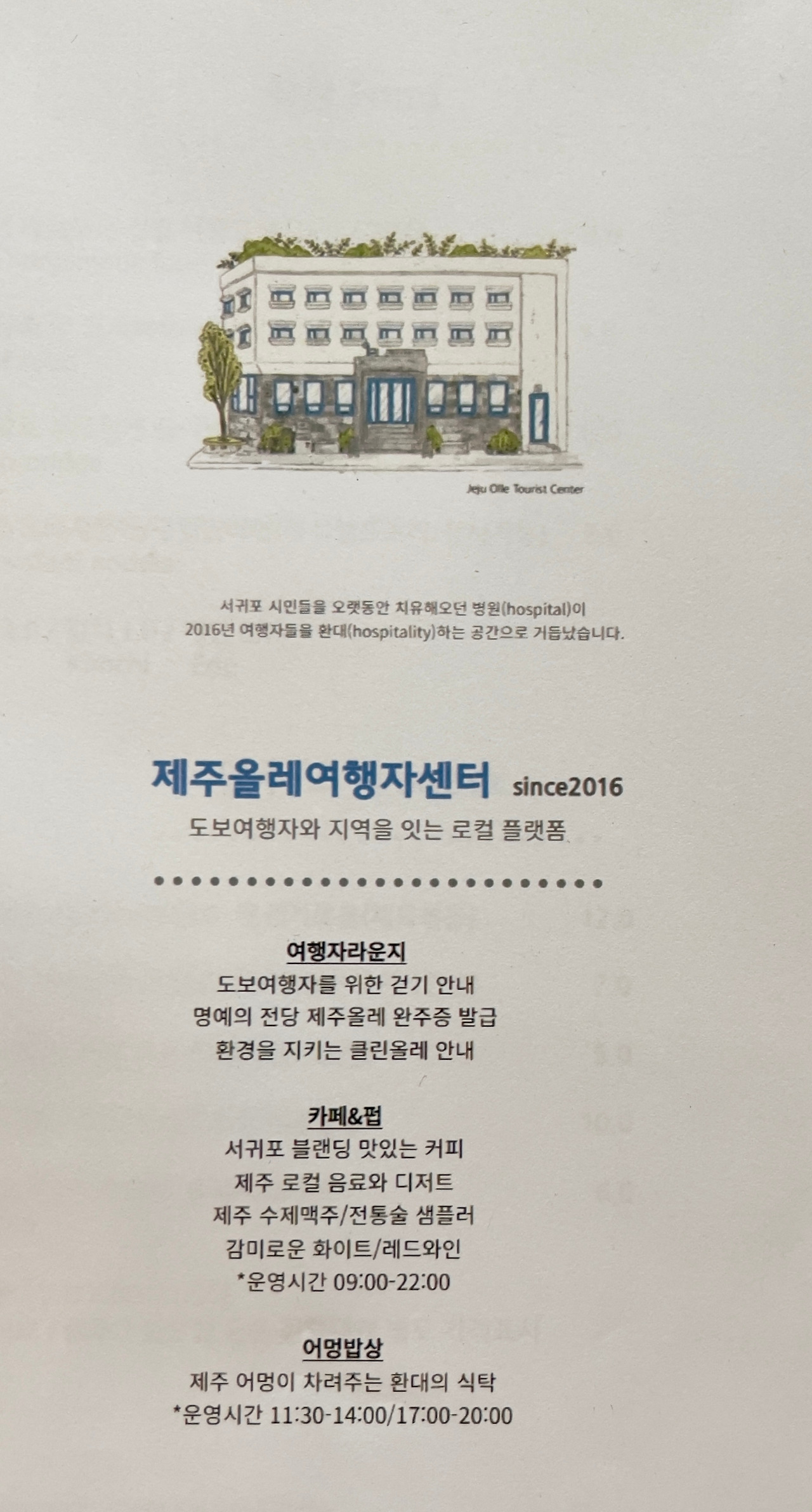 내가 채색한 제주올레 여행자센터는 한국에 수많은 걷는 길을 내도록 걷기 여행의 트렌드를 만들어낸 제주올레가 직접 운영하는 숙소이자 식당, 카페, 정보가 가득한 제주 도보 여행자들의 베이스캠프다.