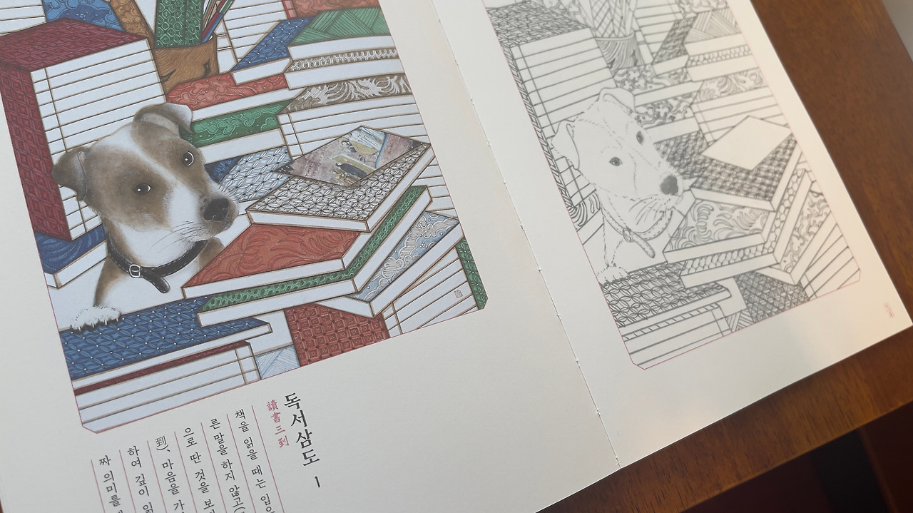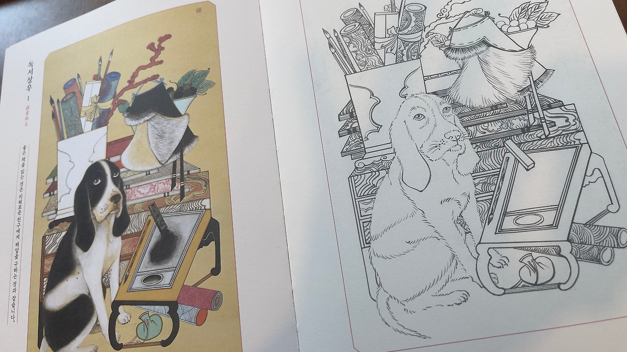 서점에 가보면 정말 다양한 컬러링북이 나와있다. 색연필 말고 과슈나 오일파스텔로 할 수 있는 것부터, 아이들 말고 민속화에 기반한 어른들을 위한 것까지 다채롭다. 언젠가 전시로 만난 곽수연 작가의 컬러링북 ‘반려견 풍속화첩’은 한국화 속 반려견들에 색을 더 해 볼 수 있어 매력적이었다.