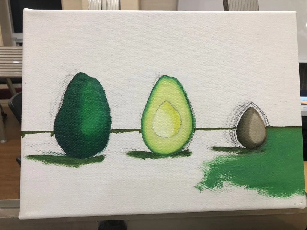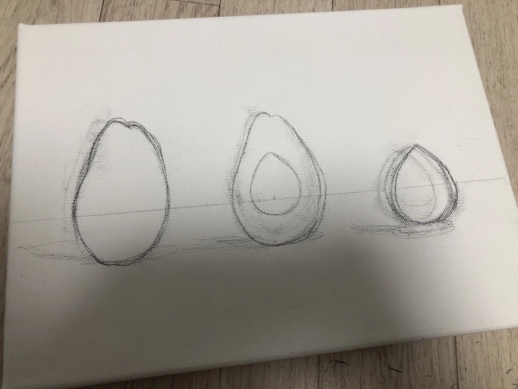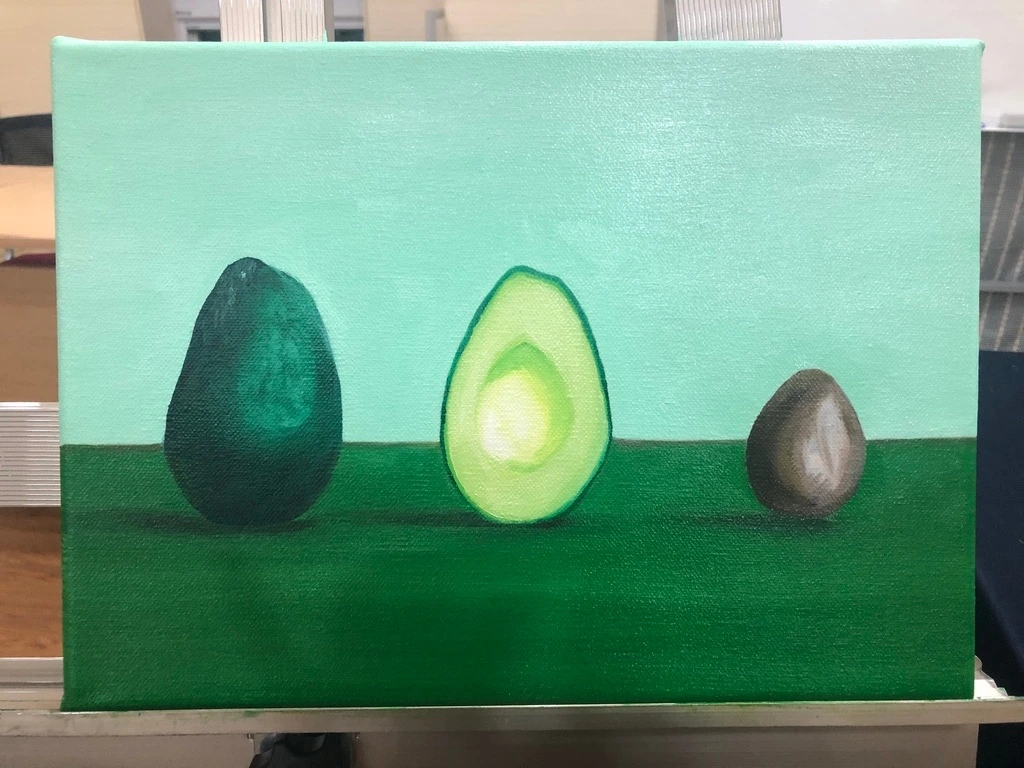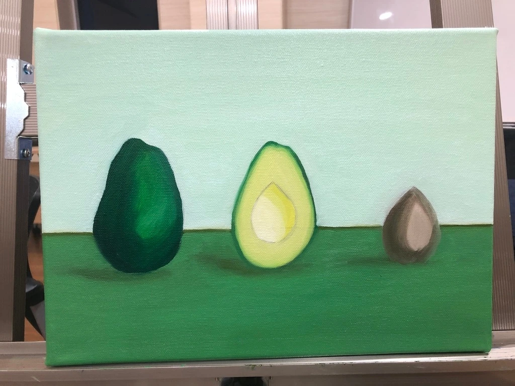 “오늘 아보카도 잘 익었네”, “씨앗은 좀 말랐네”, “한 입 먹으면 맛있겠다” 아보카도는 스케치를 시작하고 색을 더해가며 생동감이 드러날수록 수업에서 만나는 분들의 귀여움을 받았다. 정물화처럼 자연스럽게 놓여있지 않고, 정면을 향해 선 단 하나의 아보카도. 거친 표면과 부드러운 절단면, 단단해 보이는 씨앗이 나란히 서 있는 모양이 이상해 보일 법도 하지만, 4호(24.2 ×33.4cm) 짜리 작은 캔버스에 나란히 자리를 잡은 모양이 아기자기한 느낌도 주었던 모양이다.