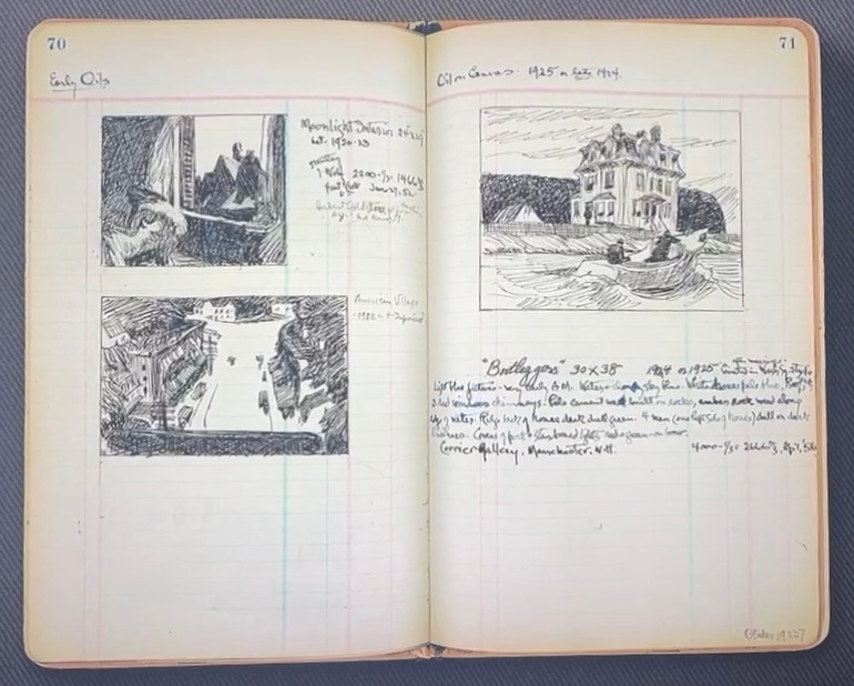 호퍼는 유화를 그리기 전에 구도를 위한 스케치는 물론, 채색을 위한 메모를 했다.