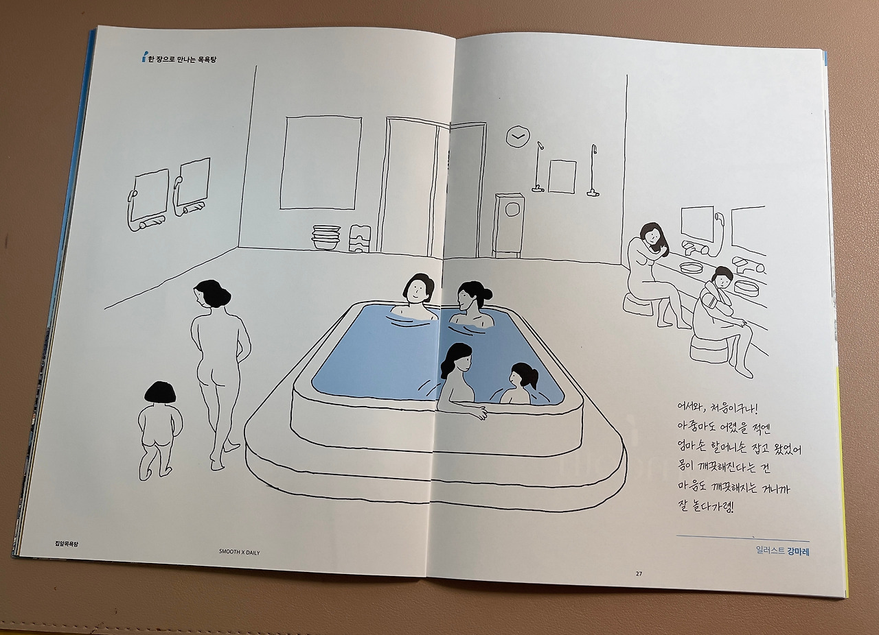 일러스트 페이지 ‘한 장으로 만나는 목욕탕’에는 목욕탕 내부풍경에 엄마와 함께 들어선 한 꼬마아이를 향한 어른들의 따뜻한 시선이 담긴 그림에 에디터의 메시지가 더해졌다.