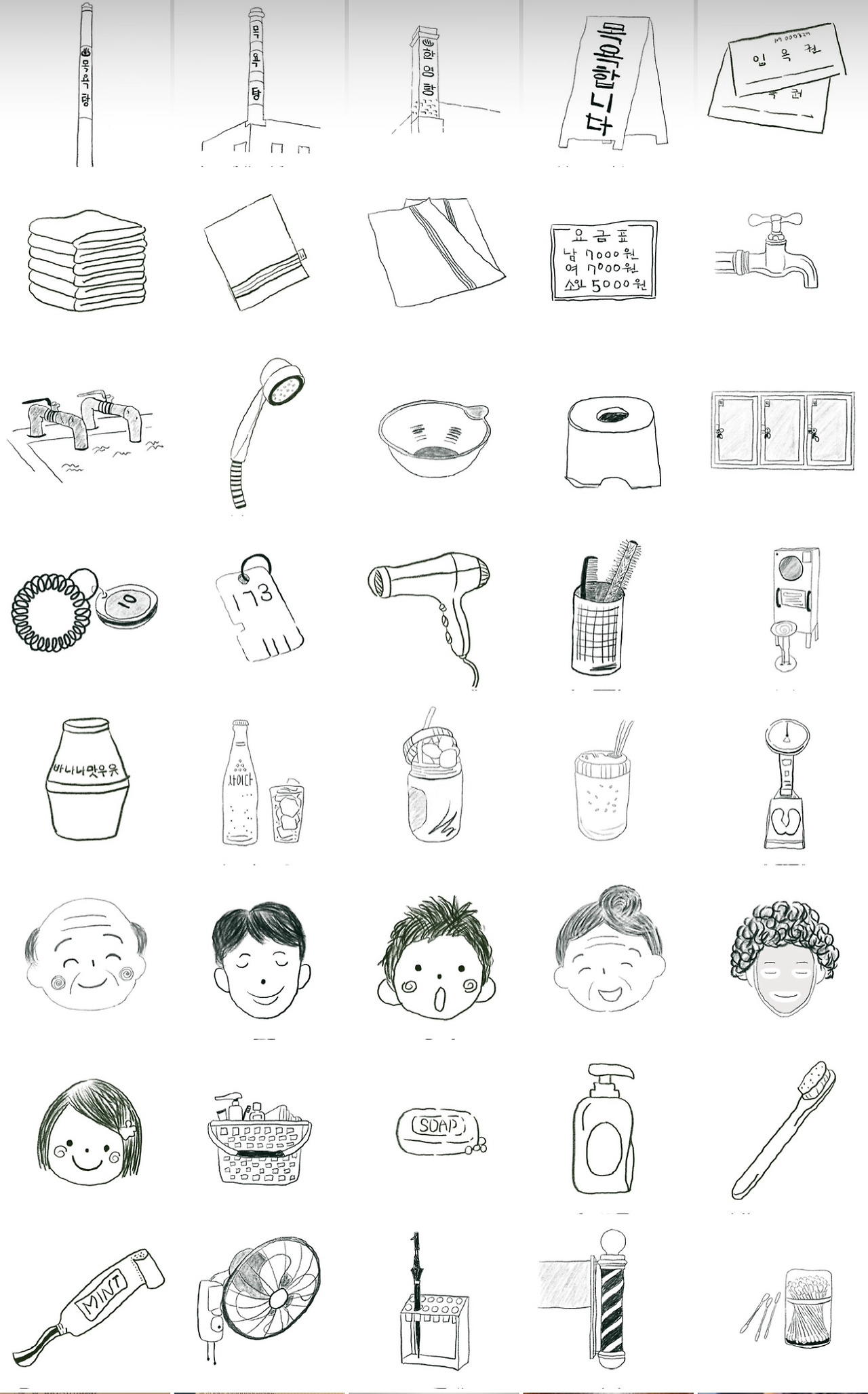 긴 굴뚝과 짧은 굴뚝, 네모난 굴뚝과 ‘목욕합니다’ 세워두는 간판, 락커와 락커 열쇠들, 바나나우유, 사이다, 식혜, 아이스커피, 샴푸, 치약, 칫솔, 비누, 목욕탕 바구니까지. 때밀이