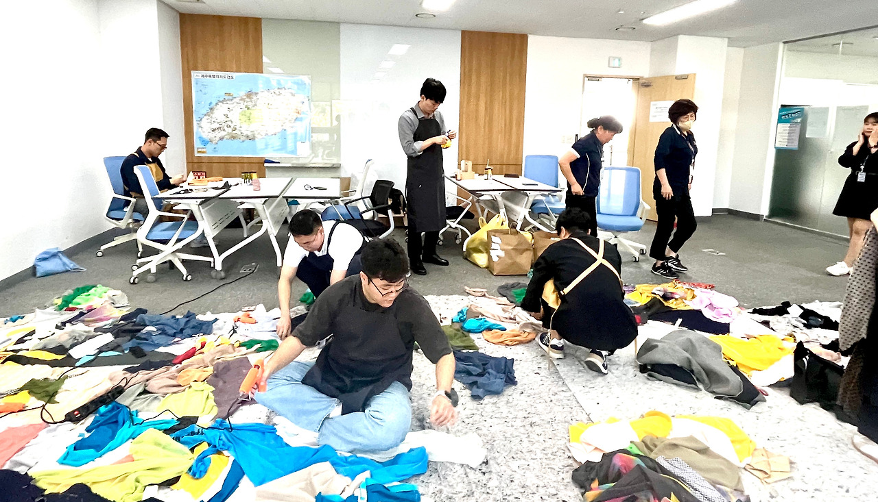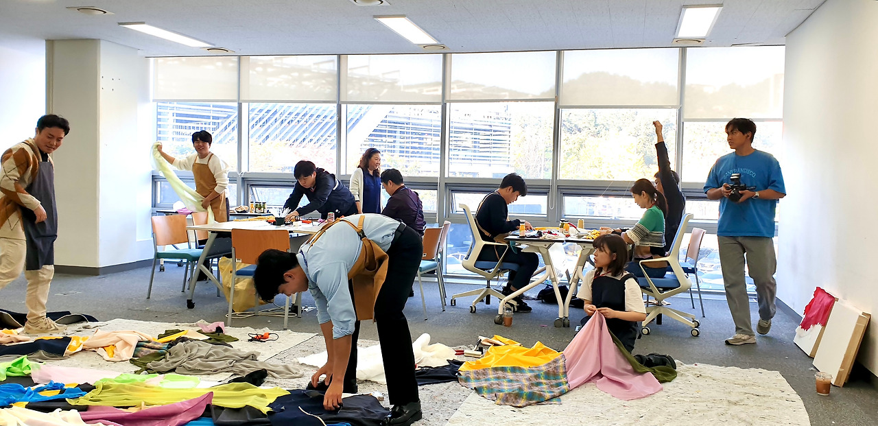 지독한 한 달이었다. 10월부터 11월에 걸쳐 한 달을 넘겨가며 매주 세 번 월, 수, 목요일 오후 2시부터 1시간씩 매번 다른 직원 12명이 참여해 천을 찢고 잇고 붙였다. 즉각적인 완성이 이뤄지는 방식이 아니라, 작품의 기초가 되는 과정일 뿐이고, 지도해 주는 시각예술인들도 있었다.