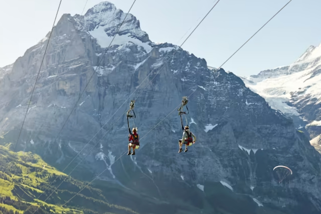 정상 피르스트에서 내려오며 즐길 수 있는 다이내믹한 액티비티가 네 가지 있다. 작년에 아이들과 함께 갔을 때 액티비티가 설명된 브로셔를 가지고 와 살펴보며 1년 넘게 고대해 왔던 스포츠다. 첫 번째는 플라이어. 정상에서 집라인을 타고 빙하가 덮인 알프스 산맥의 절경을 보며 시속 84km로 하강한다. 두 번째는 글라이더. 독수리처럼 생긴 커다란 케이블카에 두 팔은 펼치고 다리는 몸과 수평으로, 그러니까 새가 나는 자세로 고정해 네 명이 함께 탄다. 절경을 보며 독수리처럼 정상까지 올라갔다가 역시 시속 83km로 하강한다. 셋째, 마운틴 카트. 작은 카트라이더같이 생긴 액셀 없는 삼륜차를 타고 절경을 보며 구불구불 산 중턱까지 내려온다. 넷째, 트로티 바이크. 페달 없는 자전거를 타고 산 중턱부터 그린델발트 마을을 지나 처음 케이블카를 탔던 곳까지 내려온다.