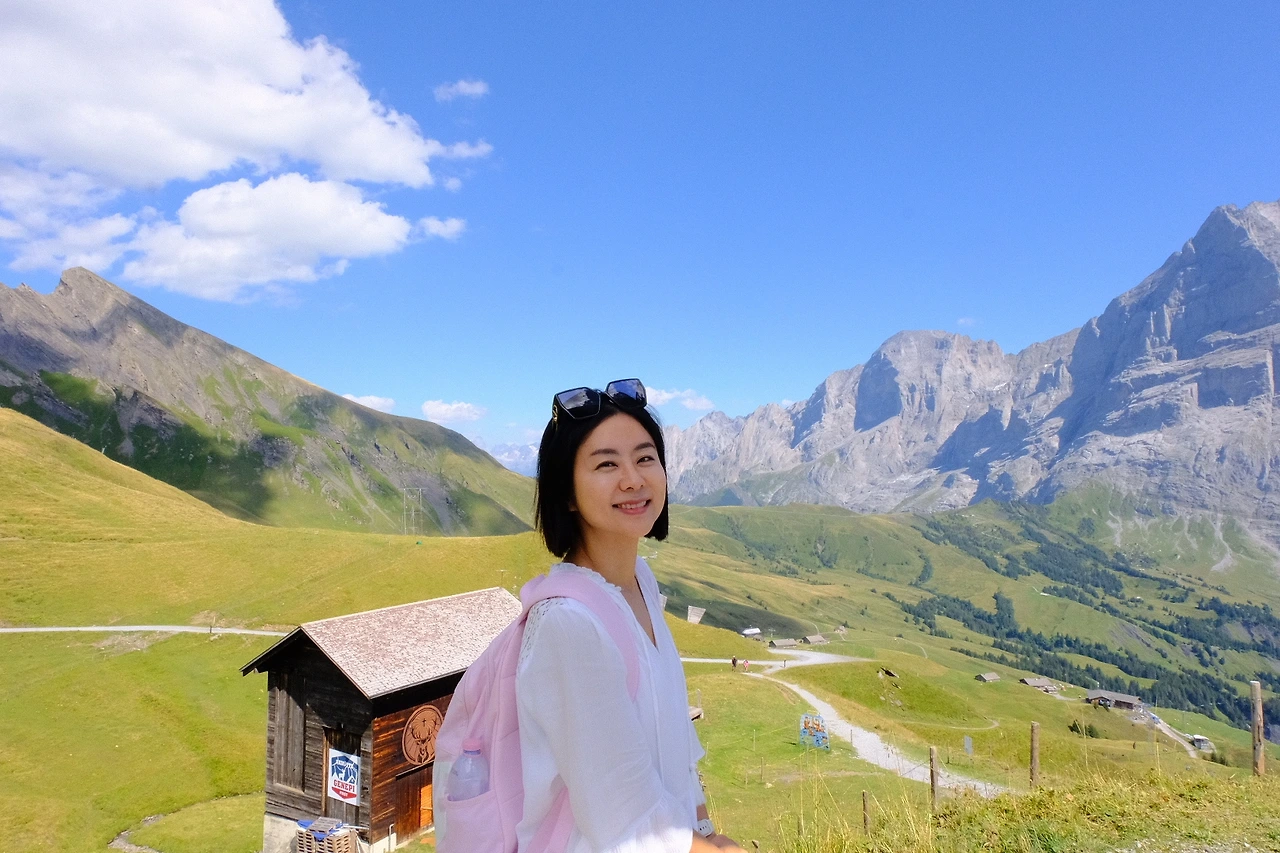 그런데 구름 없는 날씨였는데도 불구하고, 안개가 낀 것인지 이곳에도 미세먼지가 있는 것인지 희뿌옇게 가려져서 호수와 알프스산들의 색감도 뿌옇게 보였다. 마치 합성이나 필터를 끼운 것 같은 작년의 그 또렷한 진풍경과는 너무도 달랐다. 그 아름다움을 남편에게 보여주지 못하는 것이 너무 아쉬웠다. 그린델발트 올라가서도 이러면 어떡하지. 하지만 걱정하기보다는 믿기로 했다. 내가 꿈꿔왔던 그 장면을 상상하면서, 둘이 손 잡고 걸어, 거울처럼 비치는 정상의 그 맑은 호수를 마주하는 장면. 그리고 내려오는 길에는 선명한 알프스 산맥의 절경을 보며 고대했던 액티비티를 즐기는 장면.