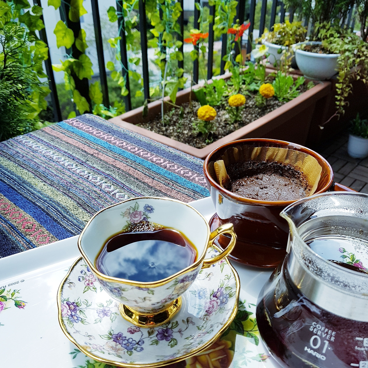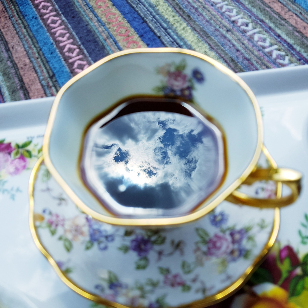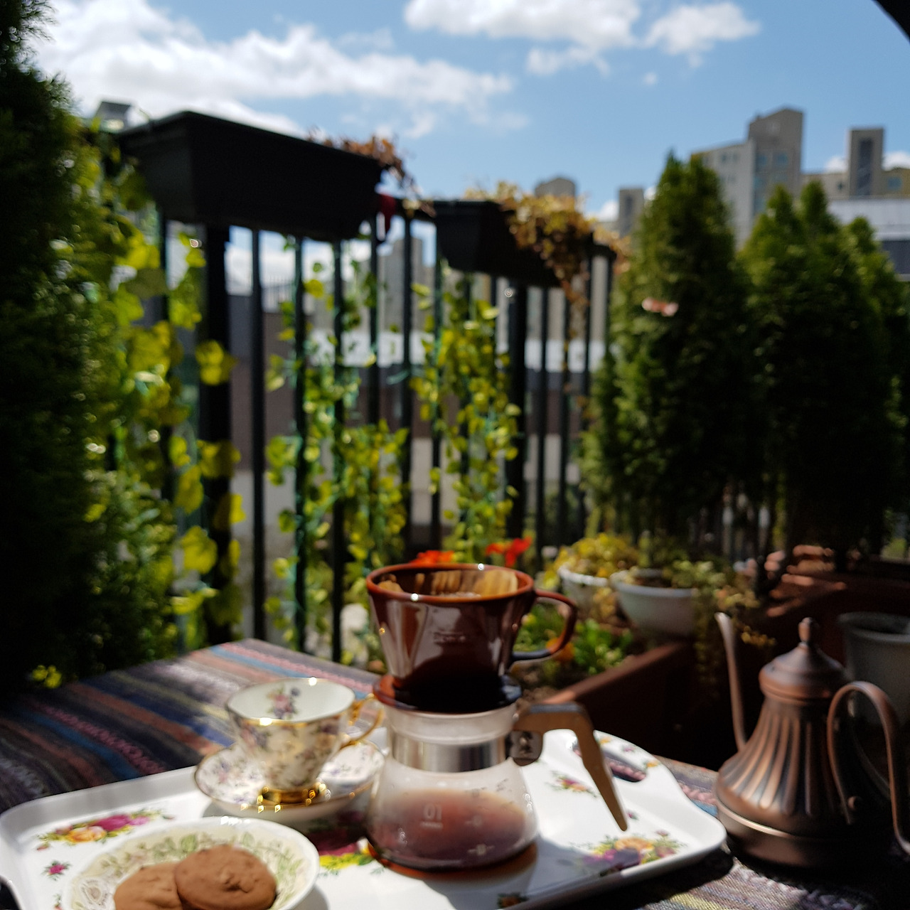 아기가 잠든 사이 조용히 방에 들어가 원두를 갈고 물을 끓여 테라스로 나왔다. 향긋한 이디오피아를 내려 잔에 따르는데, 잔을 채우고 보니 커피에 뭉게구름 가득한 하늘이 비치고 있다. 커피 한 잔 마시려다 예쁜 하늘까지 덤으로 얻은 기분.