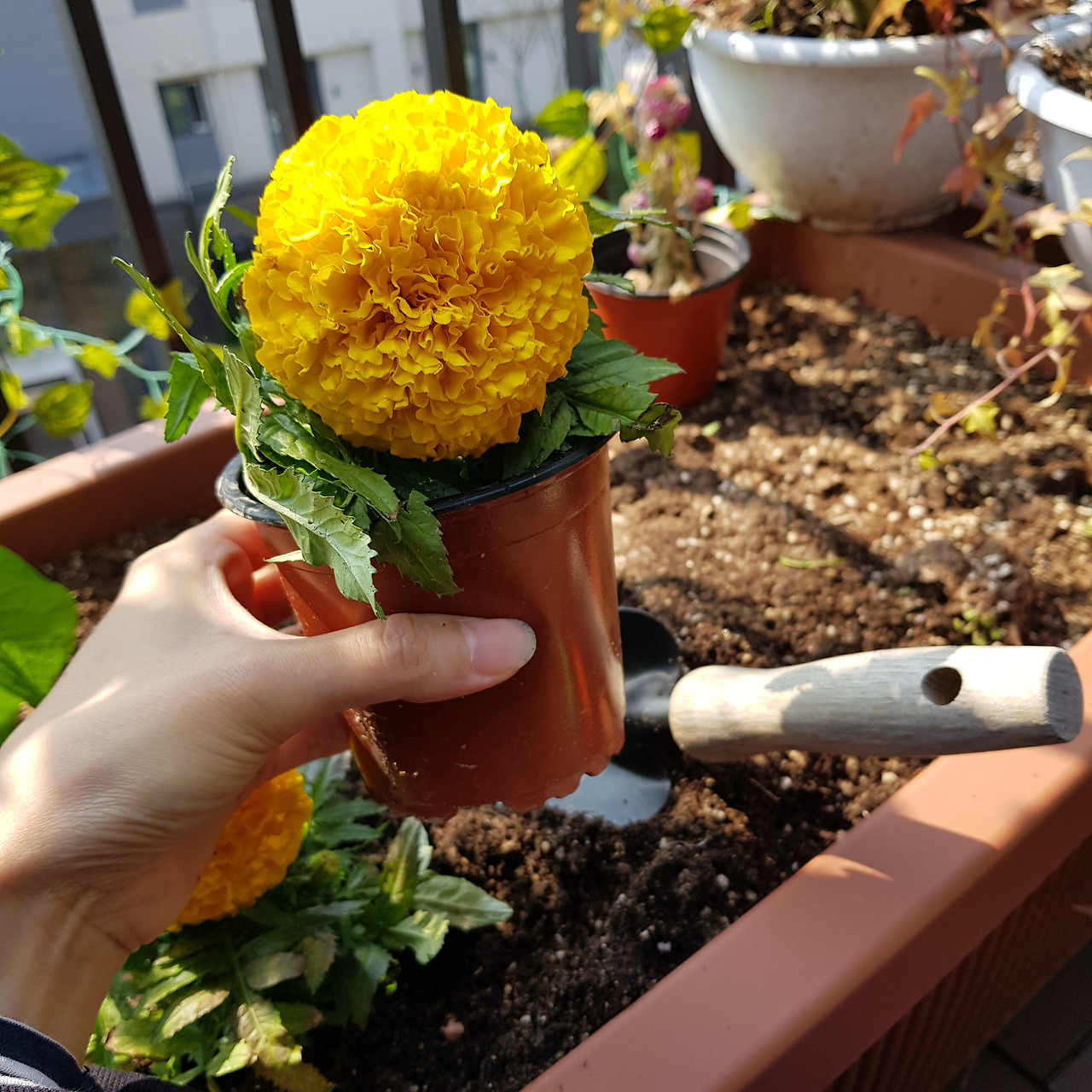 꽃을 사러 갔다. 생각보다 모종이 비싸 많이는 못 사고, 봉오리 가득 머금은 양귀비 4개와 노랗고 커다란 메리골드를 3개 샀다. 돌아와 화단에 심었다. 늘 엄마가 사다 심어주면 물만 주었었는데, 내가 직접 흙을 고르고 파서 심으니 더 내 새끼같이 정이 간다. 우리집 테라스에도 봄이 느껴진다!