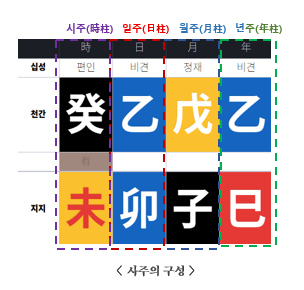 사주팔자란 이름 그대로 '네 개의 기둥(사주)'과 '여덟 글자(팔자)'를 의미한다.
