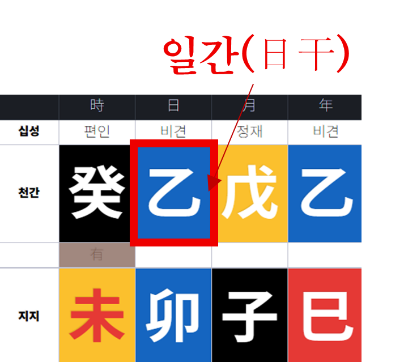 편인 비견 정재 비견 이렇게 보이는 부분이 십신이라는 것들이다. 뒤에서 차근차근 설명하겠다.