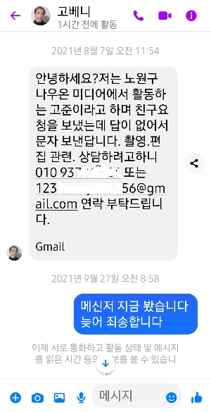 “안녕하세요? 저는 노원구 나우온 미디어에서 활동하는 고준이라고하며, 친구요청을 보냈는데 답이 없어서 문자 보낸답니다. 촬영. 편집 관련, 상담하려고 하니 010-93XX-XXXX 또는 123XXXXXX56@gmail.com 연락 부탁드립니다.”
